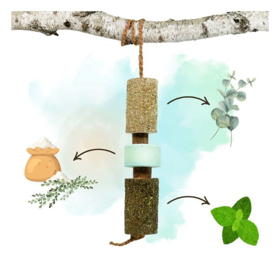 Ingredienser: Birkepinde, fyrrepinde, eukalyptus, mynte, slikkesten med mynte og eukalyptus, æteriske olier (pebermynte, golteria, dild, blanket), honning, kildevand, kokosfibersnor.