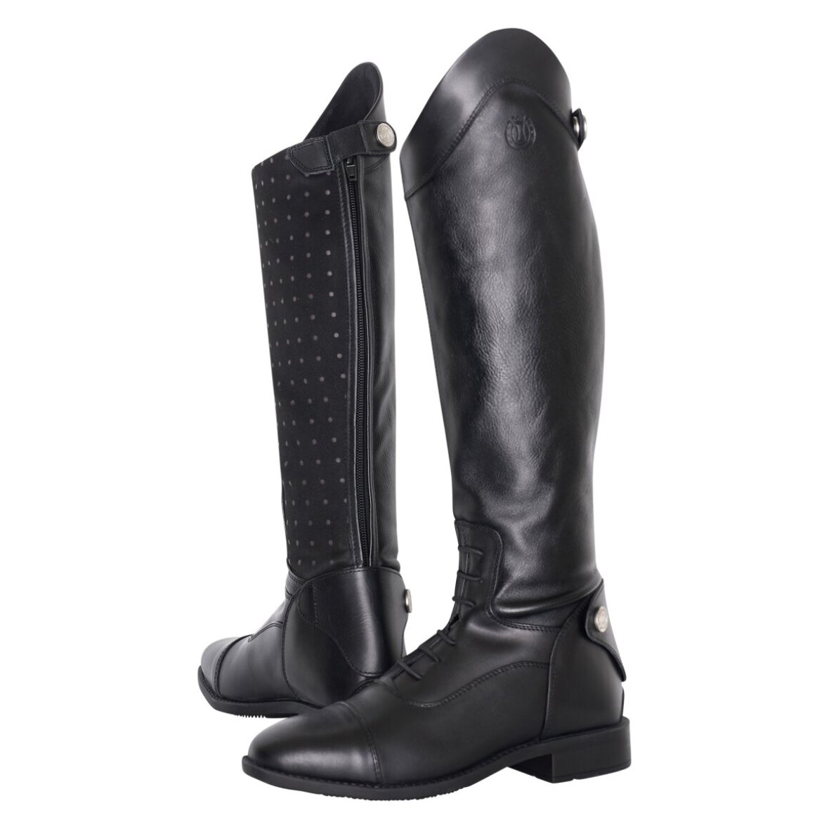 Lang børn læderridestøvle fra Imperial Riding. Denne ridestøvle er med grip på indvendig side for at give et godt greb. Fod og ydersiden af skaftet er læder. Denne ridestøvle er med snøre og lukkes med lynlås bagpå. Den er mat black og har en skridsikker gummi sål.