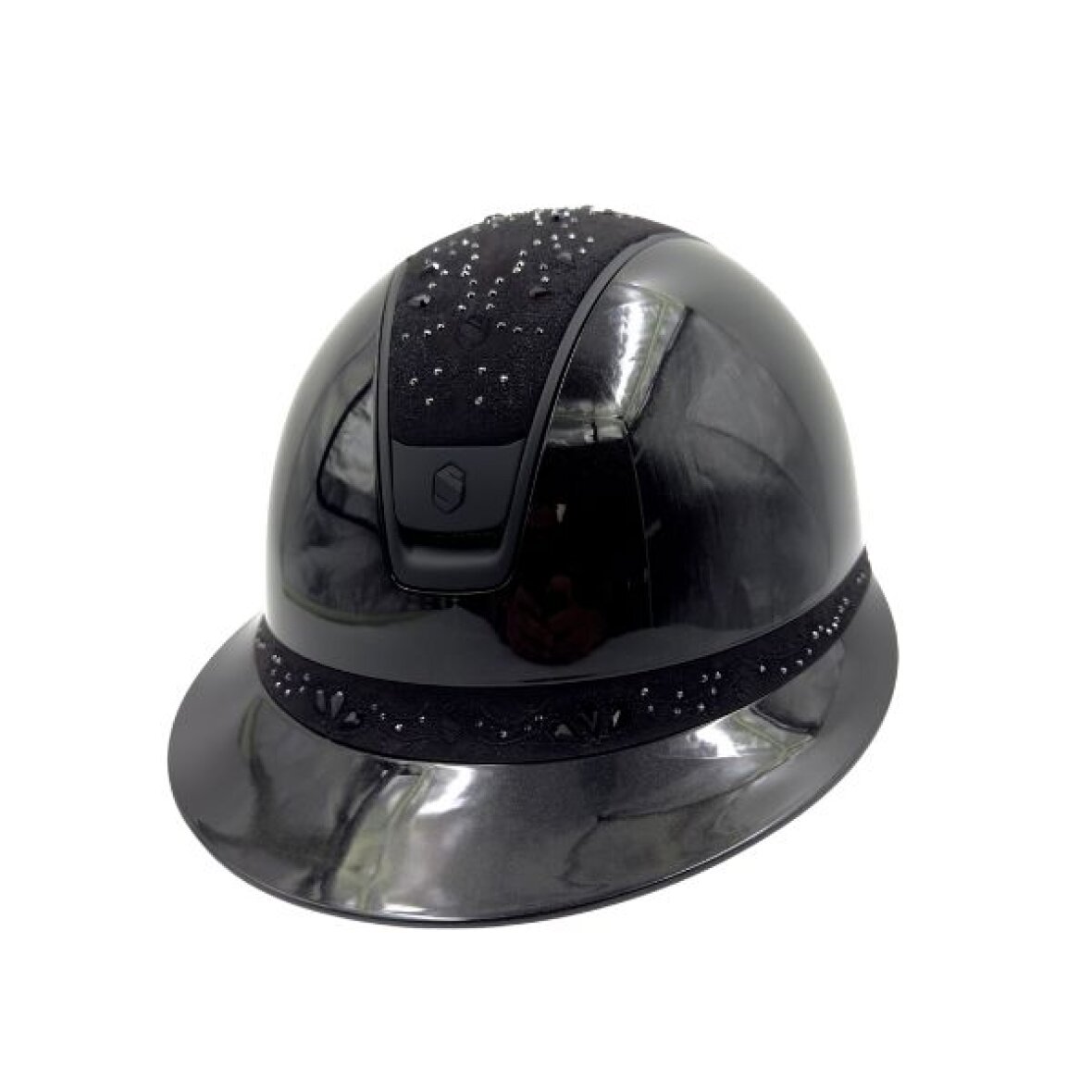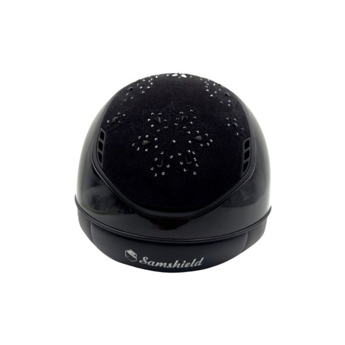 Smuk custommade Miss Shield 2.0 Samshield ridehjelm i glossy med Crystal Bloom top og frontal bånd. Trimmen og blason er Matt Black. Miss Shield 2.0 ridehjelmen har en mere oval pasform som gør at den kommer længere ned på hoved og om nakken. Miss Shield 2.0 har også fået et opgraderet luftindtag foran, som giver enestående ventilation, samt ridehjelmen har ingen direkte tryk på panden, så man undgår sved og hovedpine.