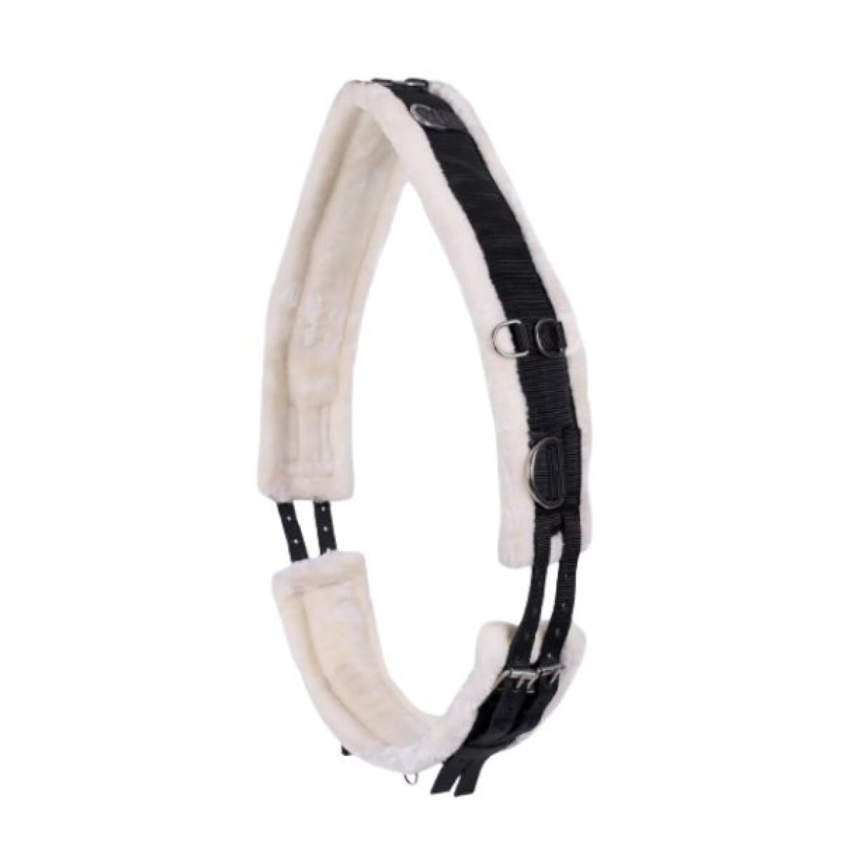 Longegjord fra QHP med blødt, imiteret lam. Gjorden er udstyret med flere ringe, så der nemt kan fastgøres forskellige longeringshjælpemidler. Der er to ringe placeret ved manken, fire ringe på hver side samt to ringe under maven. Gjorden kan justeres i begge sider med rullespænder for en optimal pasform.