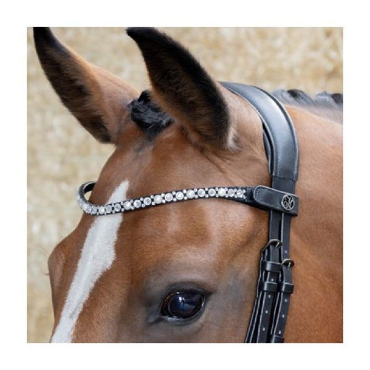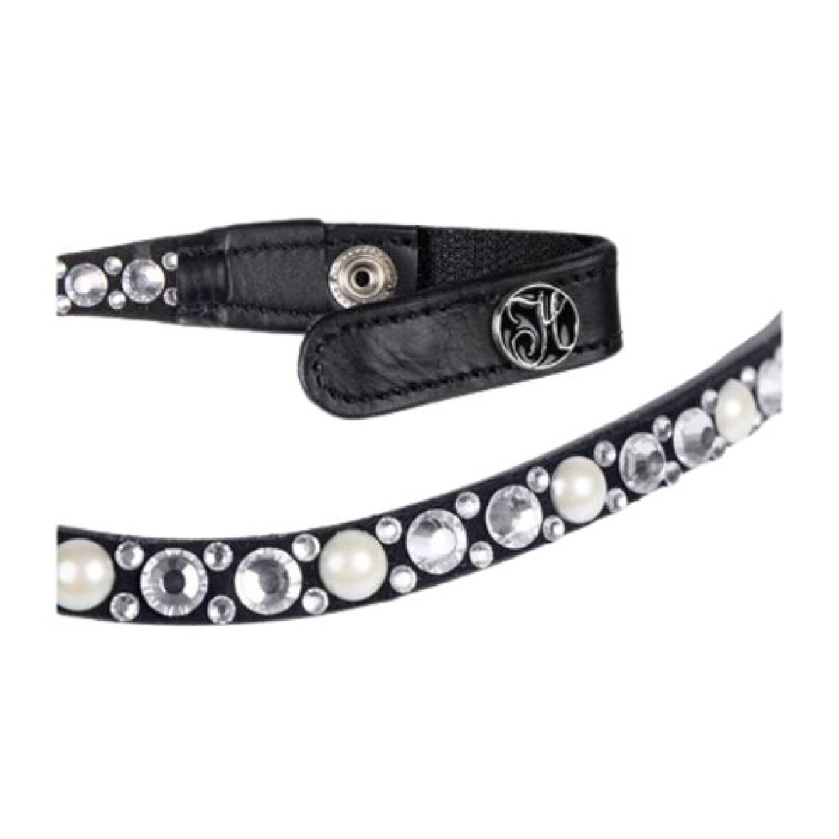 Læderpandebånd fra Harrys Horse. Pandebåndet er udsmykket med de flotteste sølvfarvede krystaller og perler. Pandebåndet kan nemt tages af og på takket være trykknapperne i siderne.