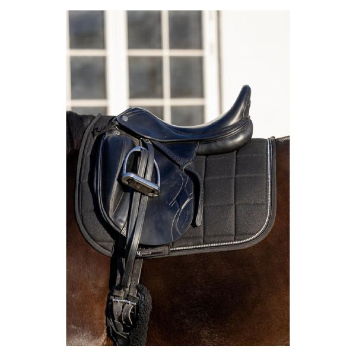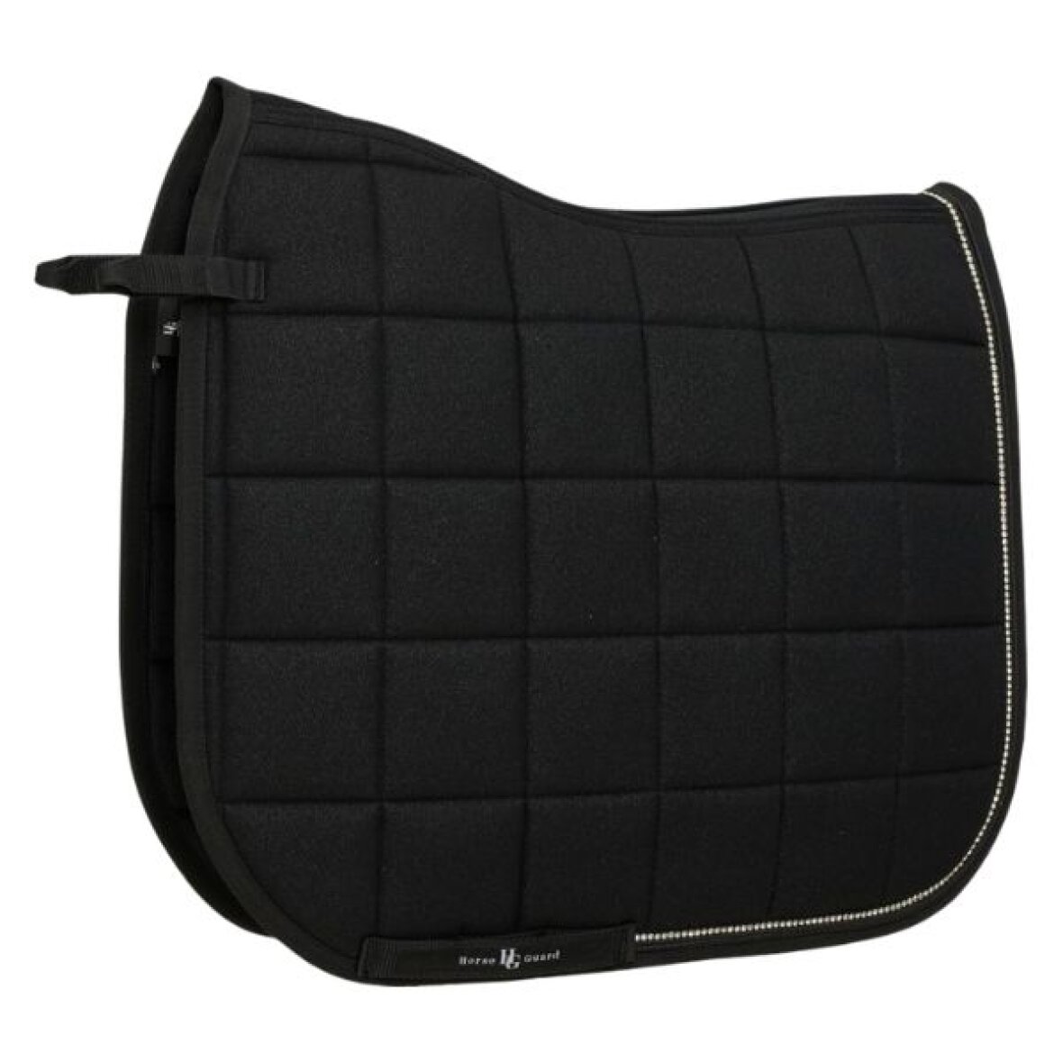 Elegant dressur underlag fra HorseGuard med smuk glittereffekt. Ryggen har et et 3D mesh-panel, som sikrer optimal ventilation og hjælper med at holde hesten afkølet under ridning. Indersiden er foret med et åndbart og fugtabsorberende Coolmax-materiale, som effektivt leder sved væk og holder hesten tør og komfortabel. Gjordstroppen er opdelt i tre, hvilket sikrer en stabil og fleksibel pasform. Underlaget fuldendes med et matchende kantbånd og funklende rhinsten, der tilføjer et ekstra touch af elegance samt et vævet logo i matchende tone ved gjordstroppen for et harmonisk og stilrent look.
