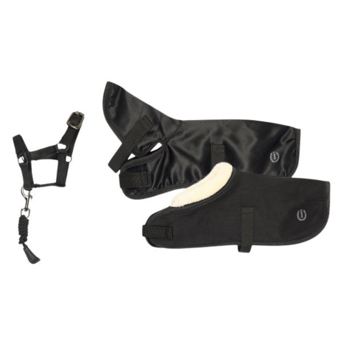 Dækkensæt med grime fra Imperial Riding til mini toy ponyerne. Sættet indeholder et fint fleecetæppe med glitrende logo, et skinnende udendørsdækken med glitrende logo samt en grime med matchende træktov.