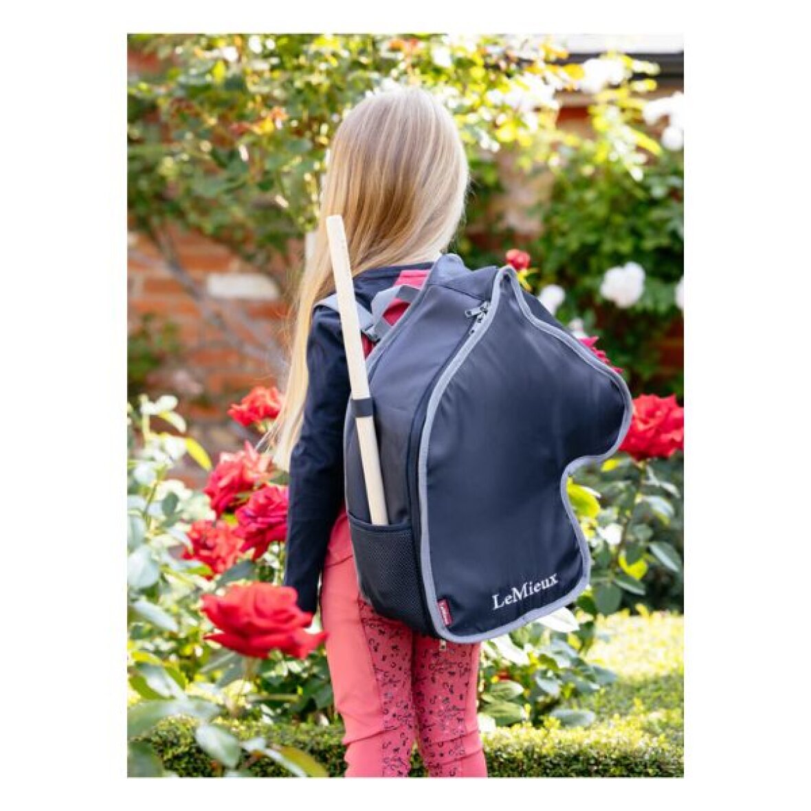 Smart rygsæk fra LeMieux til at bære din kæphest. Der er en lille lynlåsåbning i bunden af tasken, hvor stangen kan stikkes igennem. Eller, hvis du vil bære den på en mere praktisk måde, er der en sidelomme og en velcrorem til at fastgøre aftagelige stænger. Den stilrene kantafslutning og de justerbare skulderstropper gør denne taske til det perfekte tilbehør for kæpheste entusiaster.