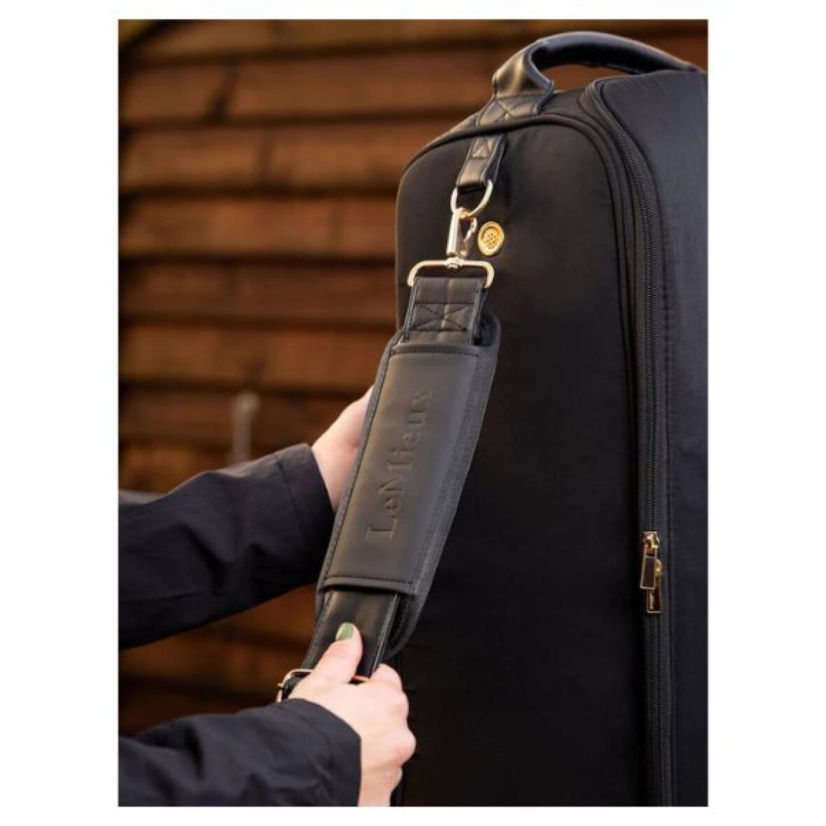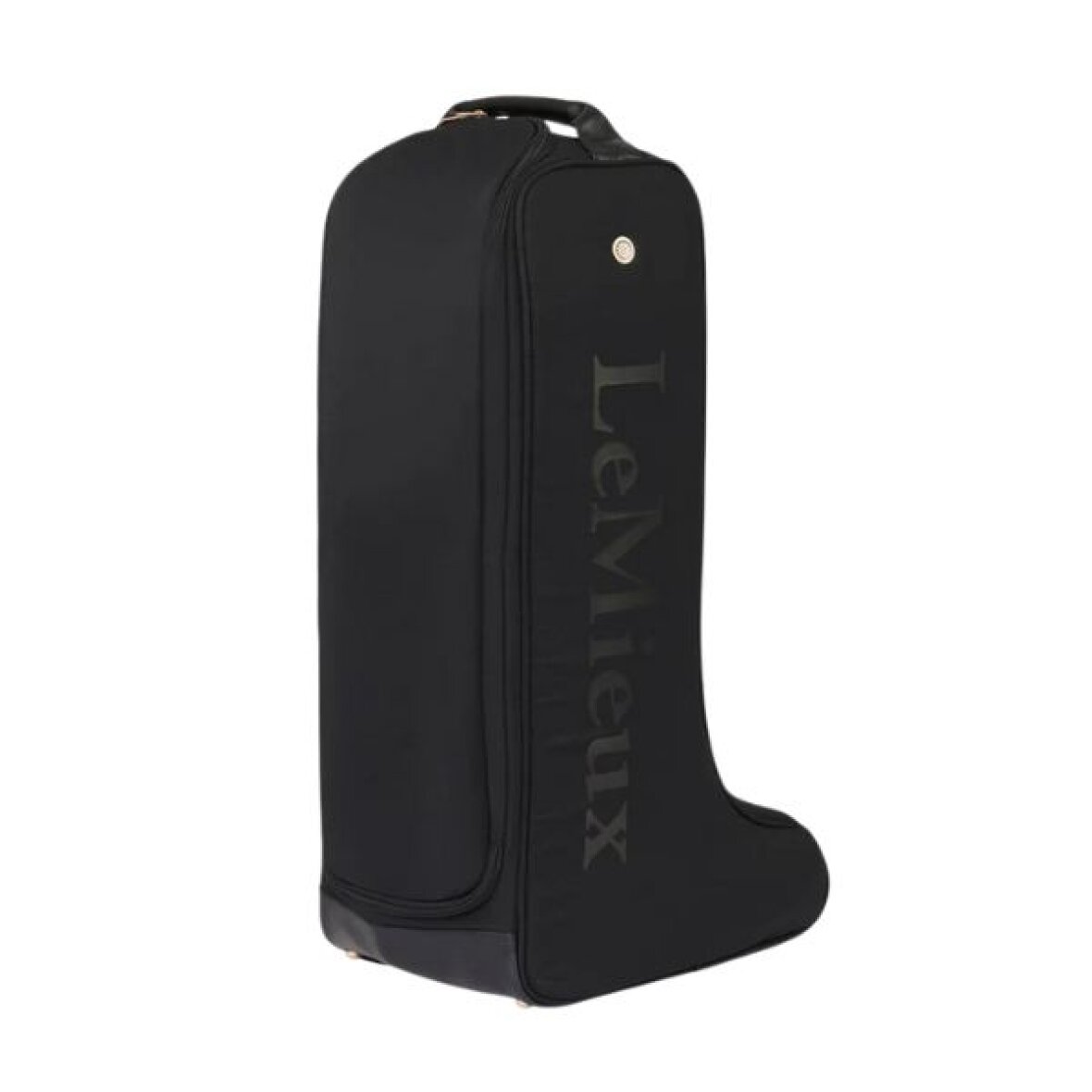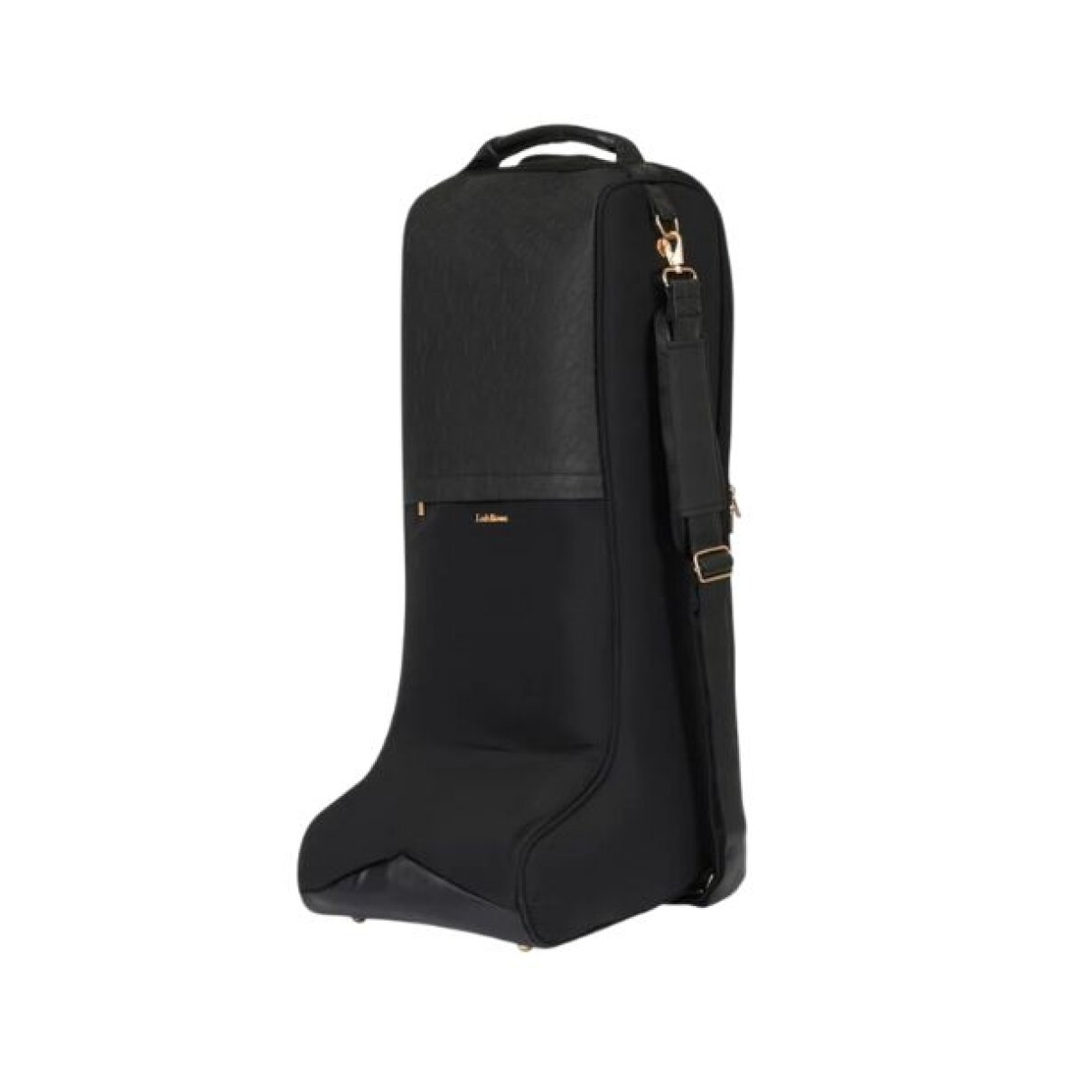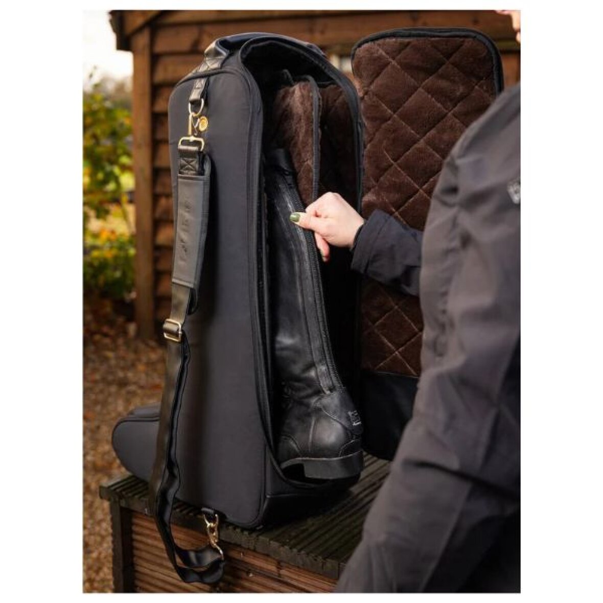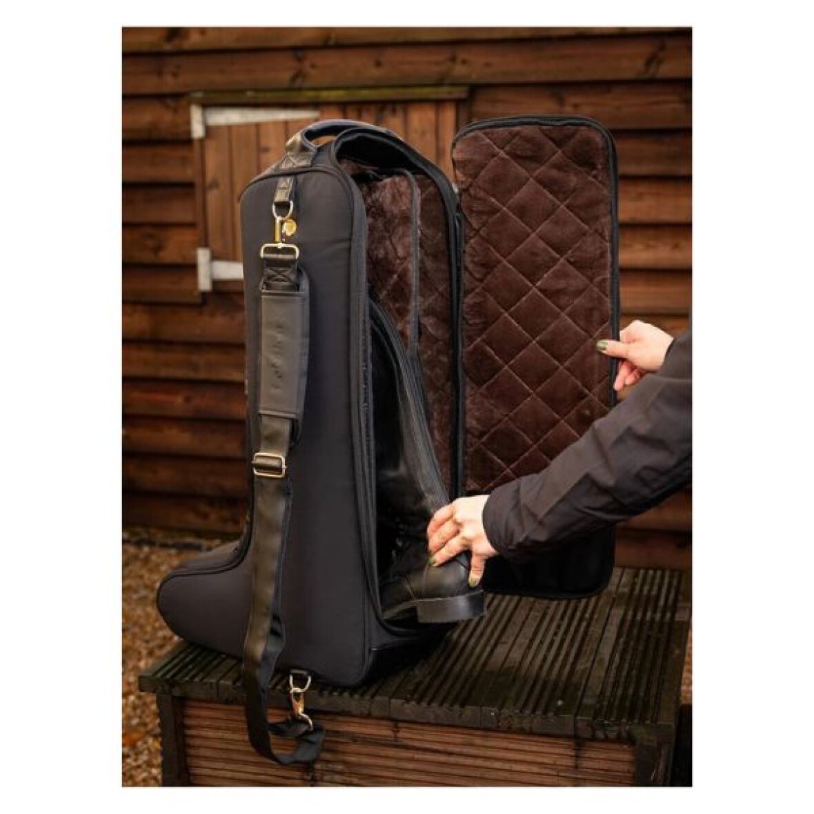 Luksuriøs støvletaske fra LeMieux. Det superbløde quiltede kunstpelsfor og skillevæggen med aftørringsvenlige kunstlæderpaneler holder støvlerne adskilt. Taskens form er designet til at omfavne støvlerne og minimere bevægelse under transport, og den store dobbelt-lynlås giver nem adgang. Den aftagelige skulderrem og det komfortable, rullede bærehåndtag i kunstlæder gør tasken let at bære.