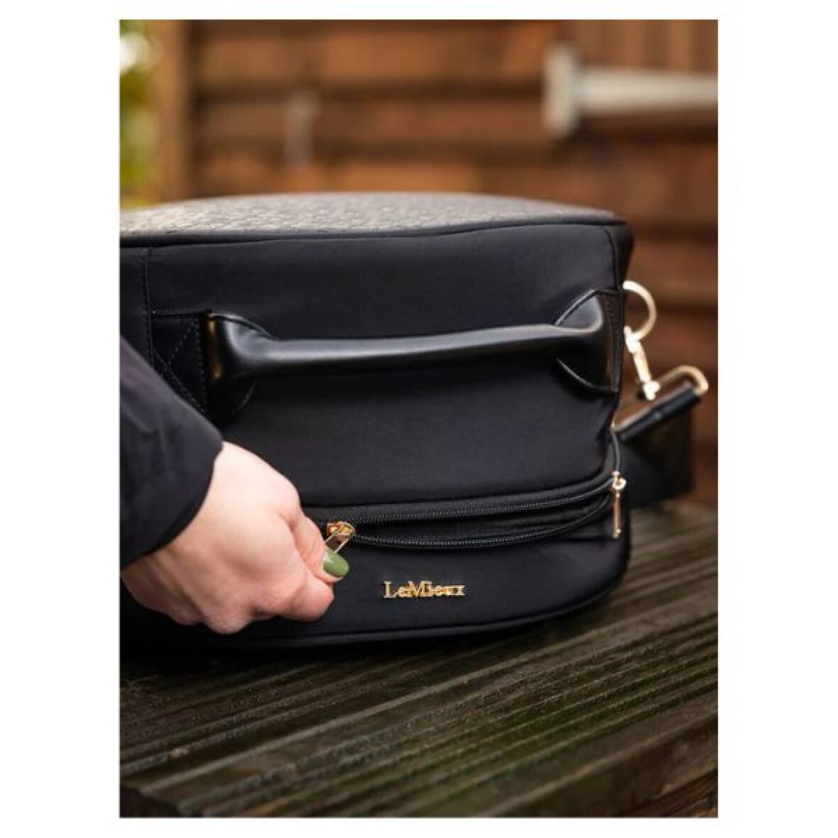 Luksuriøs hjelmtaske fra LeMieux. Den superbløde, quiltede kunstpelsforing holder din ridehjelm ren og godt beskyttet. Med en aftagelig skulderrem og et behageligt, rullet håndtag i kunstlæder. Indvendigt finder du et ventileret rum til dine handsker samt en ekstra lomme til hårnet og tilbehør. Den store dobbelt-lynlås med “clam shell"-åbning giver nem adgang til hjelmen.