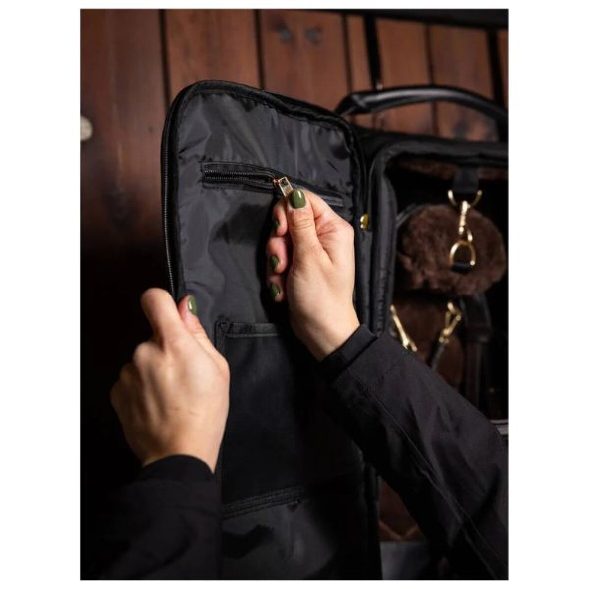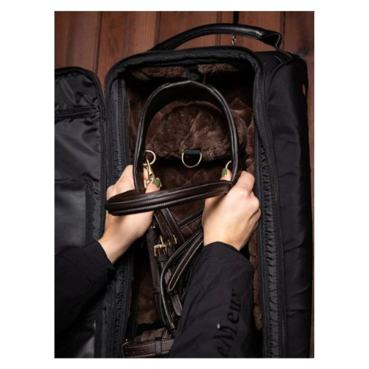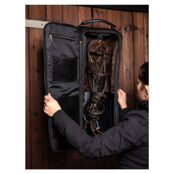 Luksuriøs trense taske fra LeMieux. Denne trensetaske beskytter og opbevarer din trense med stil - uanset om du er hjemme eller på farten En indvendig ophængskrog og klips holder trensen sikkert på plads, mens den superbløde, quiltede foring i imiteret pels sørger for sikker transport af dit udstyr. Tasken har rummelige lynlåsåbninger, aftørbare paneler i imiteret læder og mesh ventilation, som forhindrer fugtopbygning. Bær tasken nemt med det holdbare håndtag i rullet imiteret læder. Derudover medfølger der en stærk krog og kæde til ophængning. Den forreste lynlåslomme og flere indvendige lommer giver masser af plads til opbevaring af ekstra tilbehør.