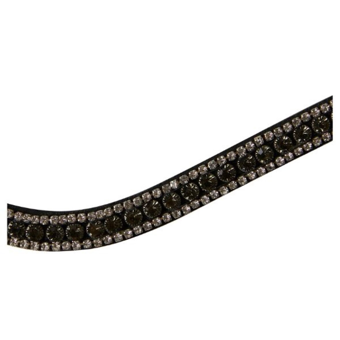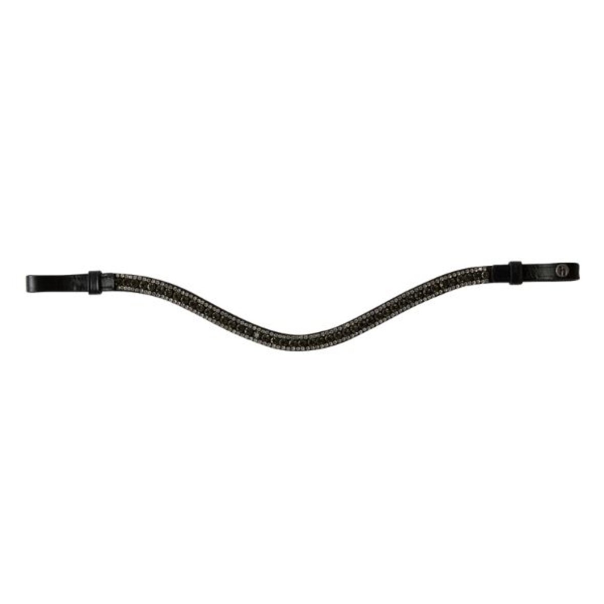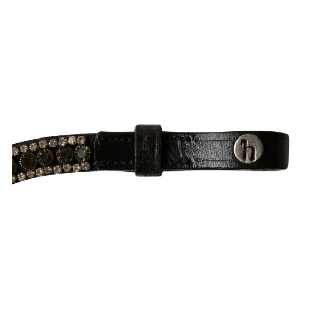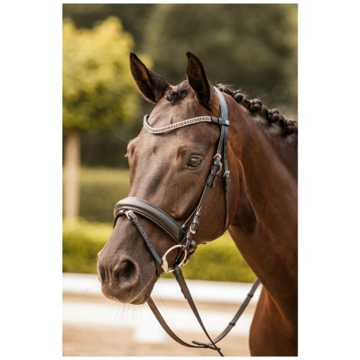 Læder pandebånd med funklende krystaller fra Horze. Pandebåndet er designet i en flot buet facon, og har tre rækker krystaller og et lille Horze-metallogo. Burrebånd gør det nemt at sætte det på.