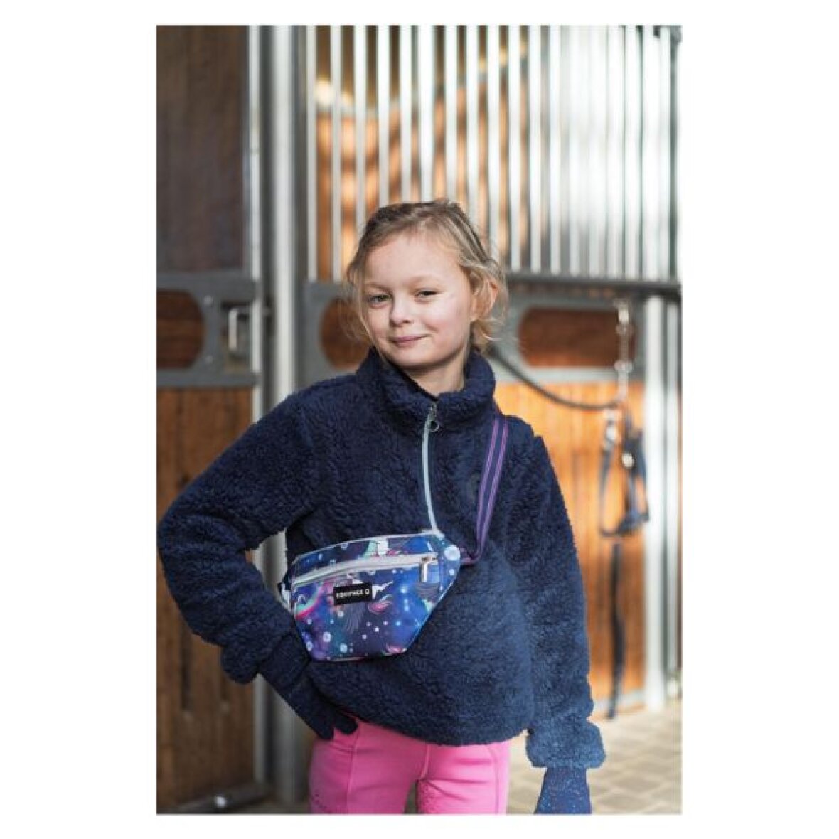 Børne bumbag med flerfarvet enhjørningemotiv fra Equipage. Den har to lommer med lynlåse, justerbar skulderrem og logo i gummi på fronten.