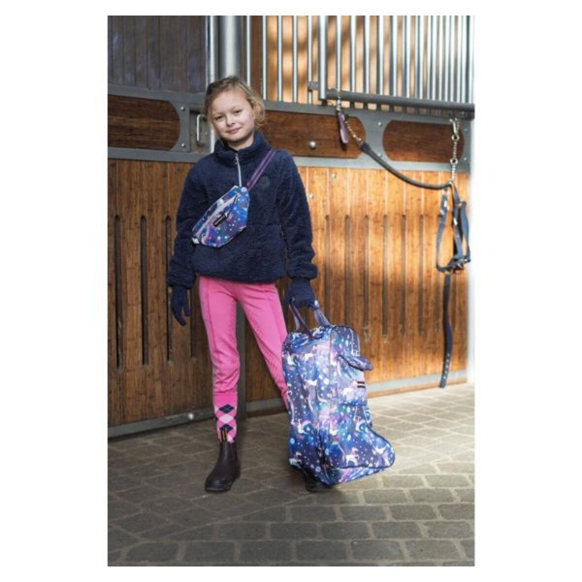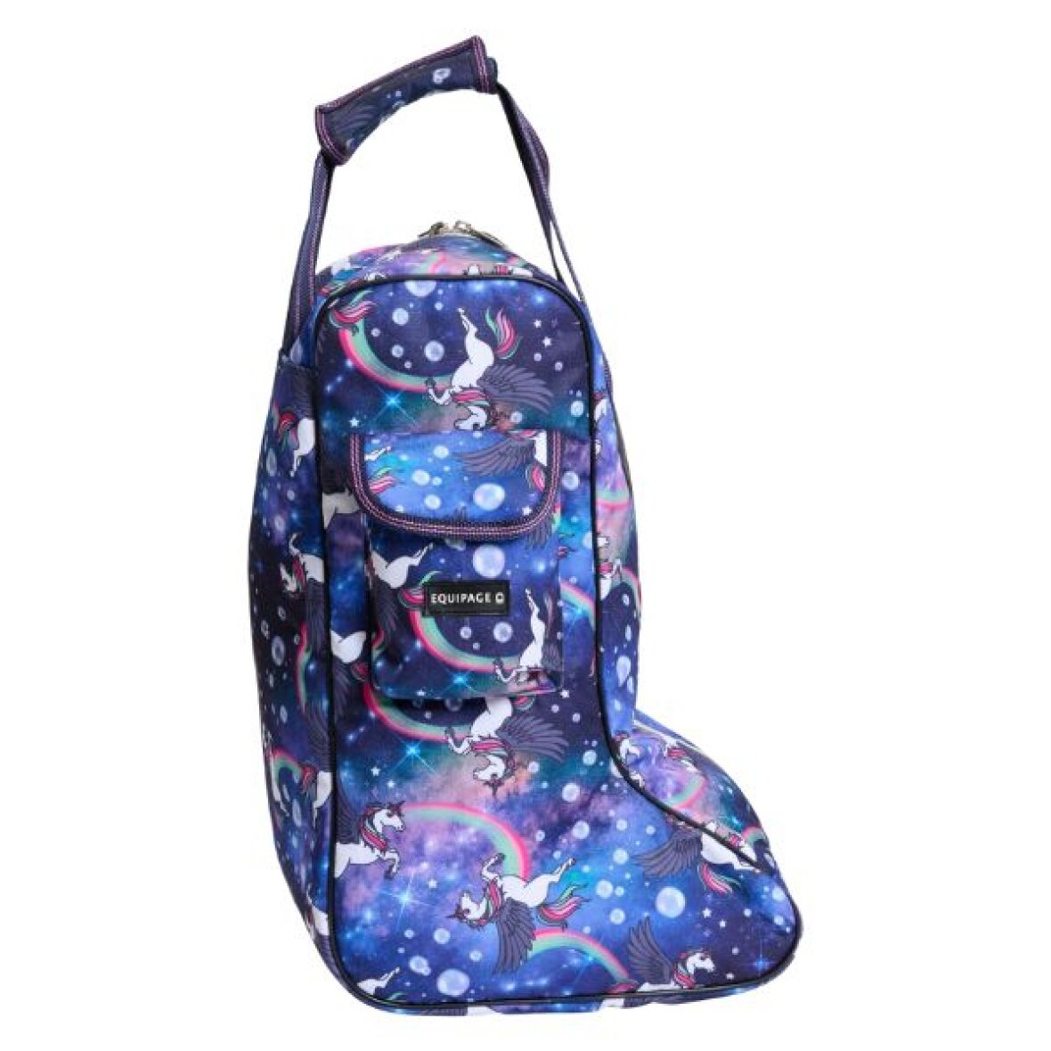 Børne støvletaske fra Equipage med enhjørningemotiv. Denne støvletaske er foret med blødt fyld for ekstra beskyttelse af støvlen og er fremstillet i slidstærkt og vandtæt materiale. Støvletasken har en udvendig velcrolomme til opbevaring af eksempelvis sporer eller handsker og polstrede håndtag med stigbøjlelogo i gummi.