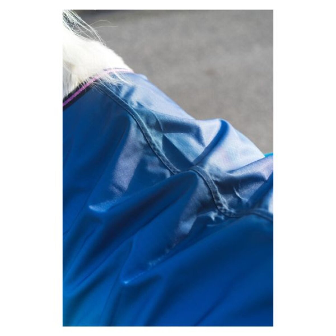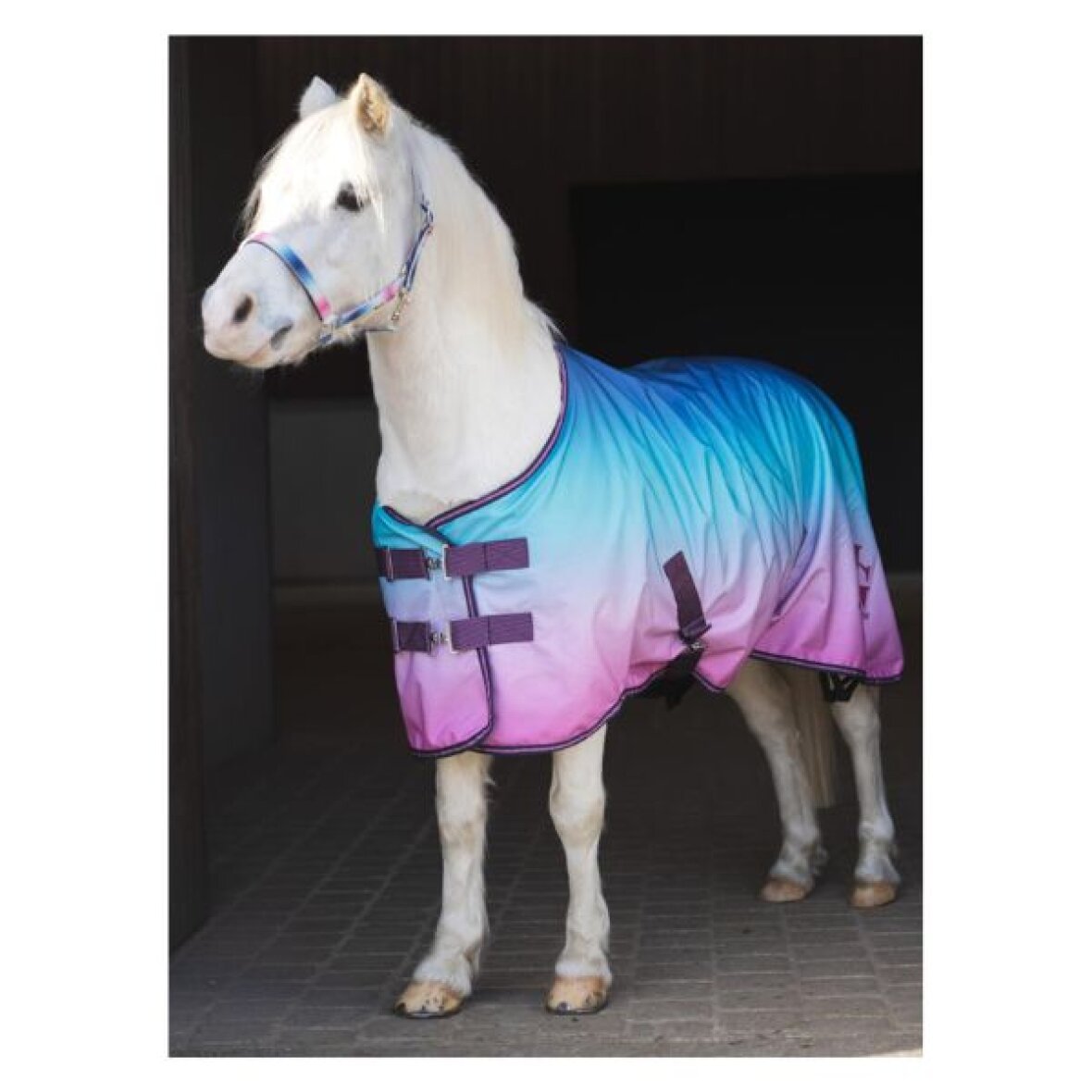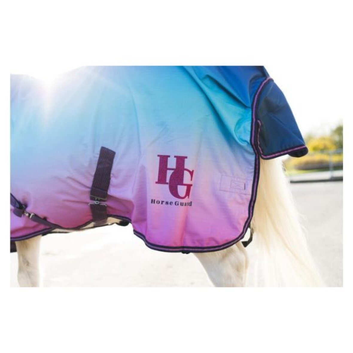 Sødt regndækken med fleeceforing fra Equipage. Regndækkenet er fremstillet i 600D ripstop polyester, der er 5000 mm vandtæt og 5000 mvp åndbart. Bagpå prydes dækkenet af et glitrende HorseGuard-logo og glitterstriber i webbing og i kanten giver et ekstra magisk look. Dækkenet har dobbelt justerbare T-spænder og velcro foran, aftagelige og justerbare krydsgjorde under maven samt haleklap og elastiske benstropper, som sikrer en stabil og komfortabel pasform.