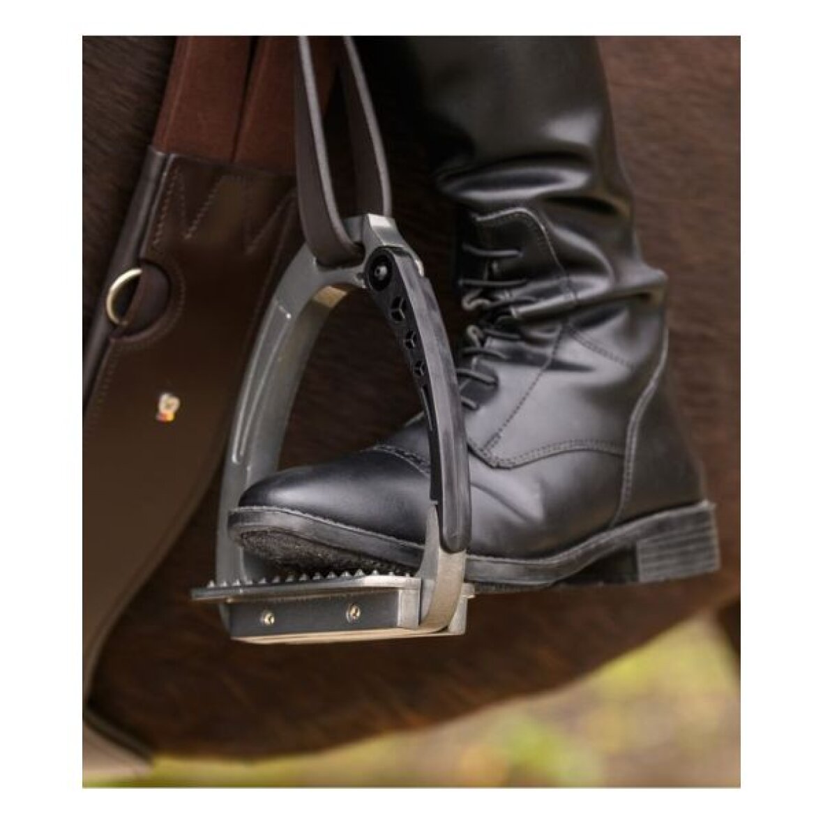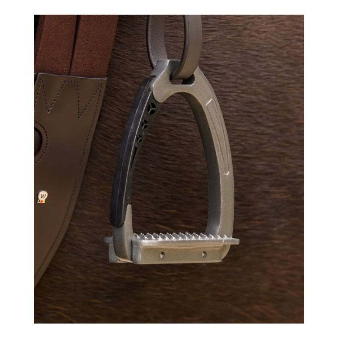 Stigbøjler fra Waldhausen fremstillet i højkvalitets aluminium. Trædefladen måler 6,5 cm i bredden og 11 cm i længden, hvilket giver et stabilt og komfortabelt fodfæste under ridningen. Den ydre side er udstyret med en smart sikkerhedshængsel, der åbner sig ved rytterens vægt i tilfælde af et fald. Dette mindsker risikoen for at blive fanget i stigbøjlen og øger sikkerheden markant.