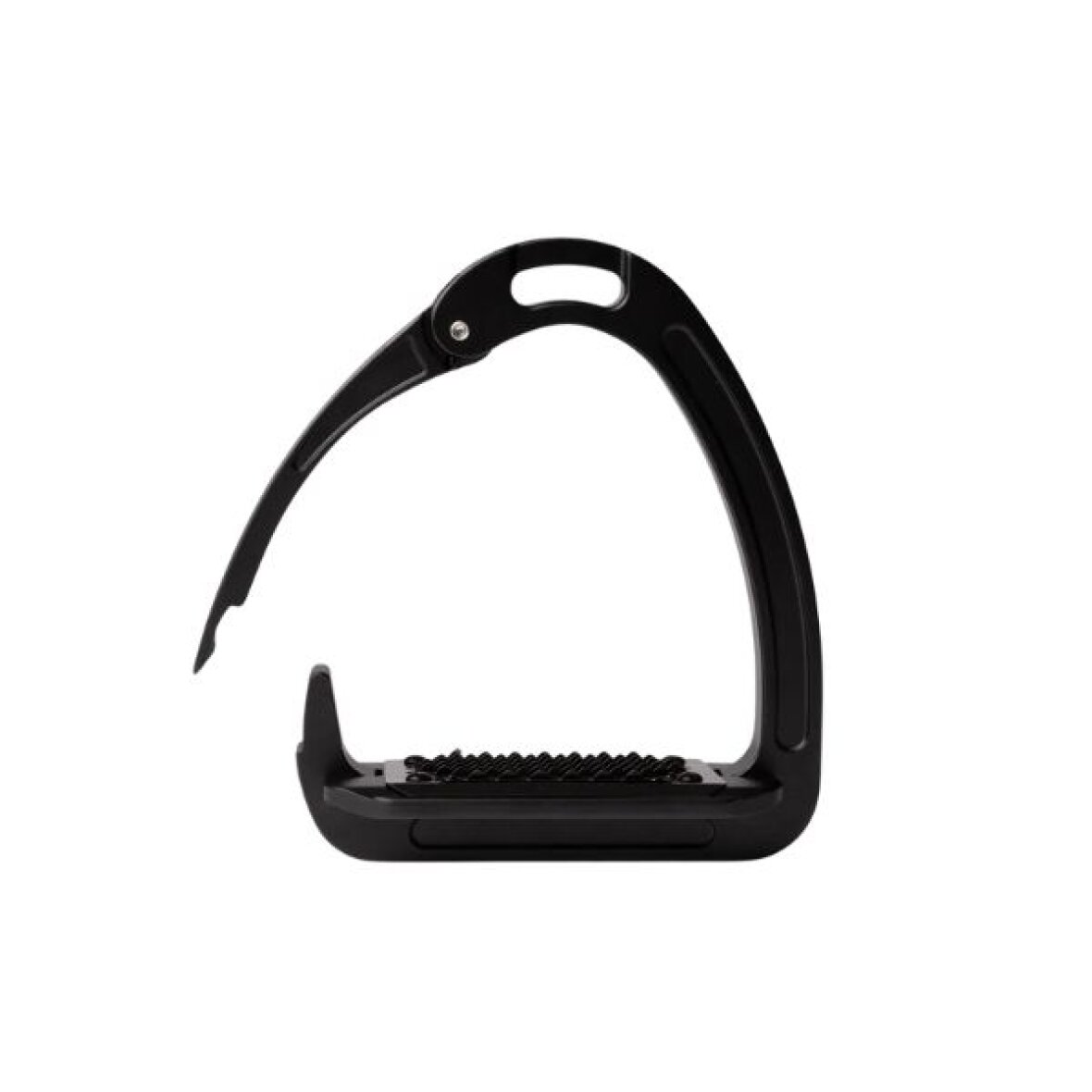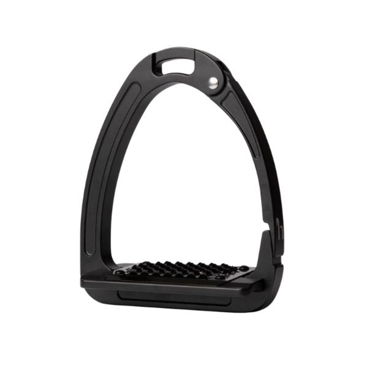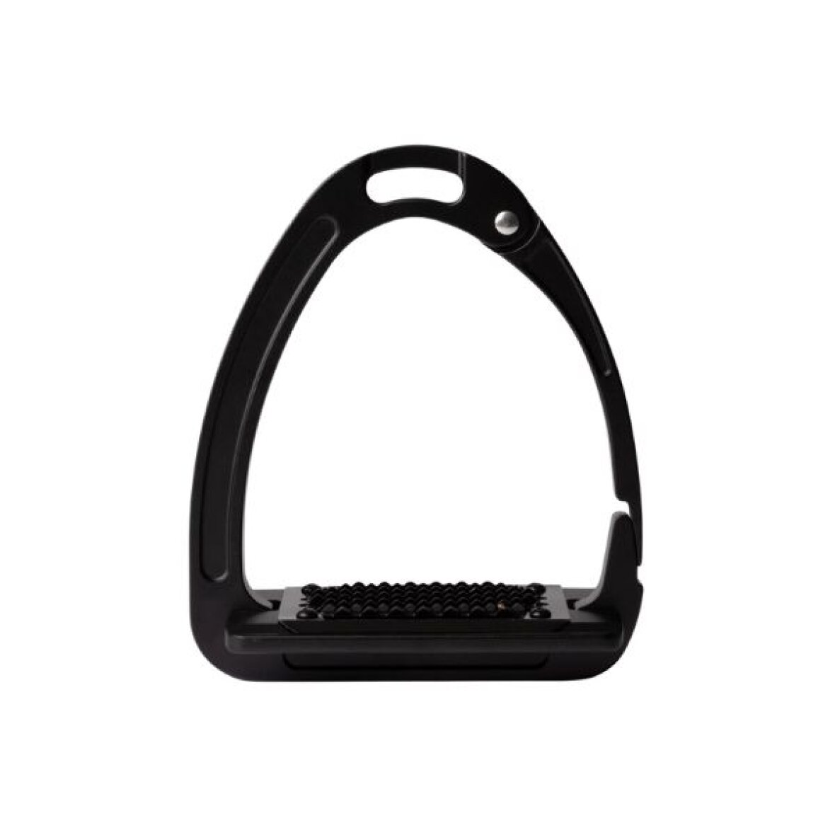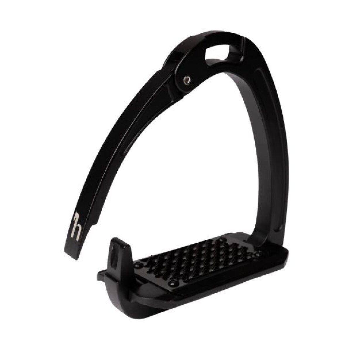 Stigbøjler fra Horze, som er fremstillet i anodiseret aluminium af høj kvalitet. Stigbøjlerne har en trædeflade i rustfrit stål, som gør dem ekstra holdbare og sikrer, at de ikke let bliver slidt eller ruster. Designet med små, runde huller i bunden, som forhindrer, at sand og snavs sætter sig fast, så rytteren altid har et stabilt og sikkert greb. Sikkerhedsmekanismen er placeret lidt over trædefladen, så den ikke åbner ved et uheld, men samtidig sidder åbningen øverst på bøjlen, så den fungerer hurtigt og pålideligt, hvis du får brug for den. Trædefladen er vinklet fem grader for at støtte en korrekt og afslappet rideposition, hvilket mindsker belastningen på knæ, hofter og ankler.