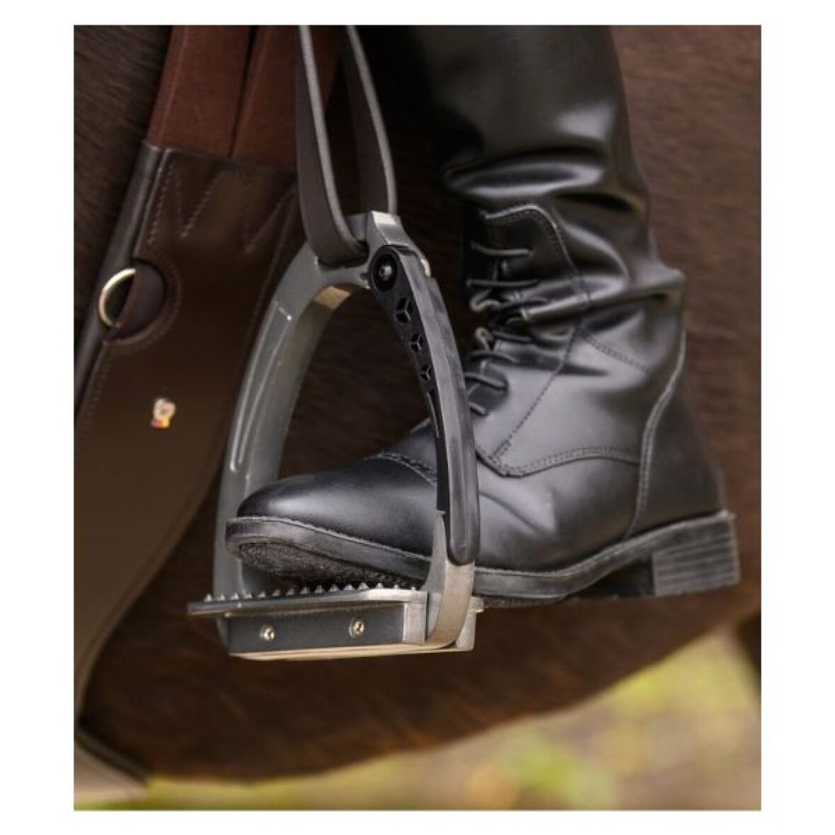 Sikkerheds stigbøjler fra Waldhausen af højkvalitets aluminium. Stigbøjlerne har en åbningsarm, der åbner sig i tilfælde af at rytteren falder af og forhindrer rytteren i at hænge fast i stigbøjlen.