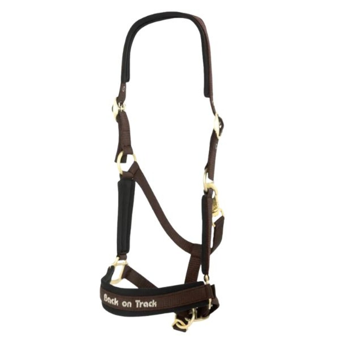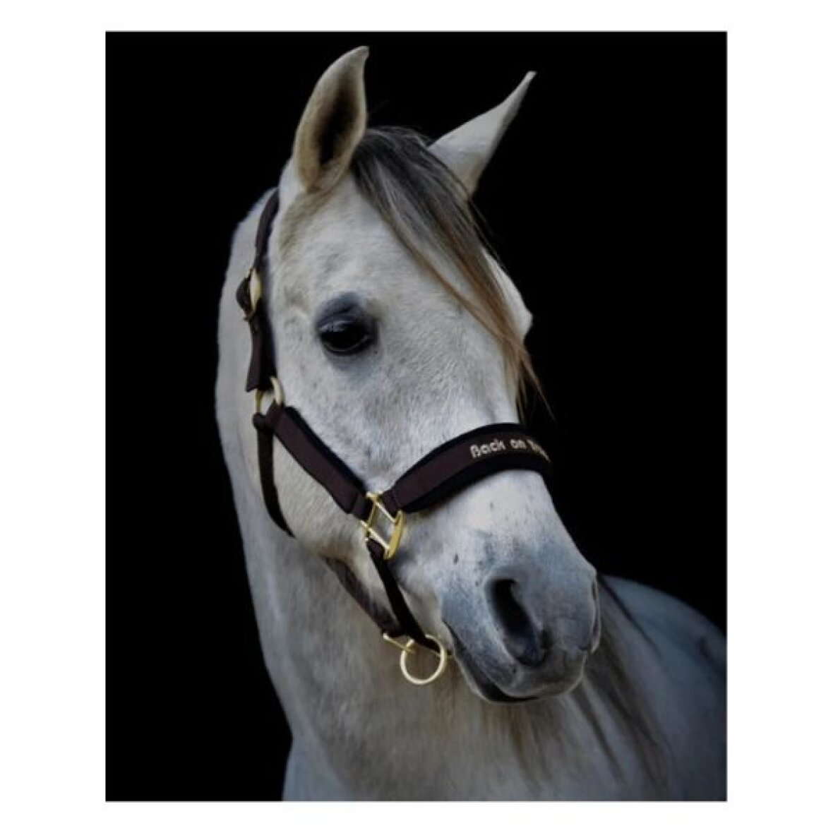 Let og flot grime fra Back on Track. Denne grime er med neoprenforing i nakke, næserem og sidestykkerne og har flotte matte guld farvet spænder. Grimen kan justeres 3 steder i størrelsen og har broderet Back on Track på næseremmen.