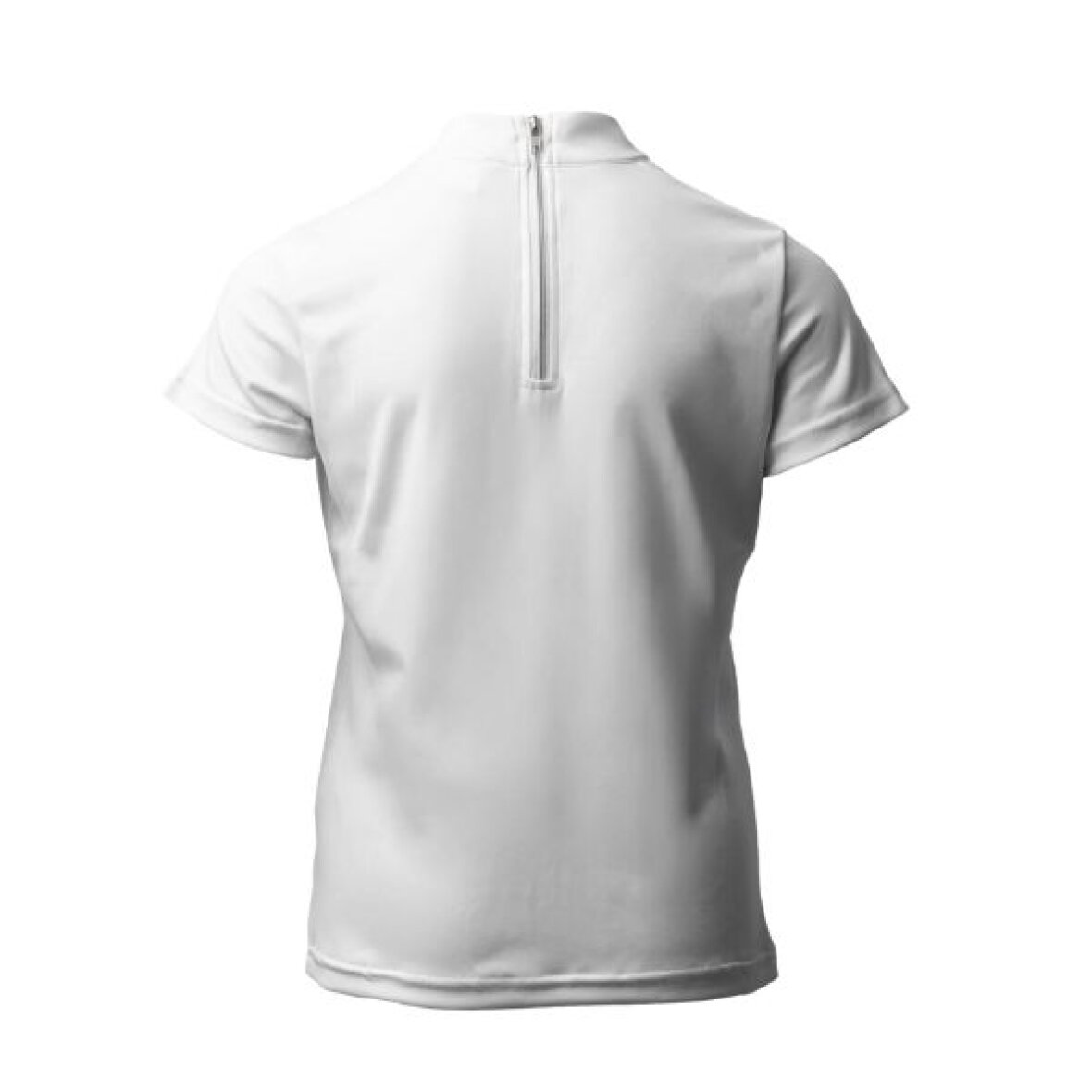 Funktionel børne stævnebluse fra Horze. Blusens øverste del af fronten er fremstillet af mesh og prydet med rhinsten, så det glimter lidt ekstra på banen. Blusen har en opretstående krave med kort lynlås i nakken, så den er nem at tage på og af. Lille Horze metallogo på kanten. Stævneblusen er fremstillet i hurtigtørrende og åndbart materiale.