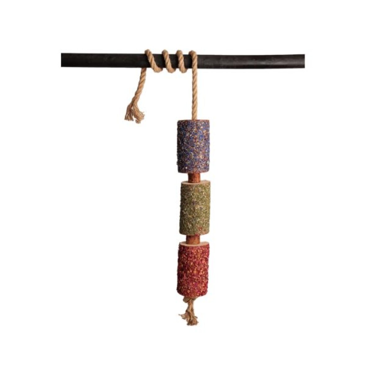 Hestelegetøj i træ fra Kentucky Horsewear. Legetøjet fungerer som en naturlig og sansestimulerende beskæftigelse, der hjælper med at reducere kedsomhed og understøtte hestens mentale trivsel gennem duft, struktur og naturlig tyggeadfærd. Freedom-versionen er beriget med en livlig blanding af urter og blomster, som bringer farver, variation og naturlige egenskaber ind i hestens hverdag. Kornblomst bidrager med antiinflammatoriske- og fordøjelsesunderstøttende egenskaber, mens vilde rosenblade tilfører et naturligt indhold af antioxidanter samt en mild, tiltalende duft. Hindbærblade er værdsat for deres støtte til hormonel balance hos hopper, muskelafspænding og næringsrig støtte til fordøjelsen, og echinacea er tilsat for sine immunstyrkende egenskaber samt støtte til luftvejene. Hvert stykke træ er håndudvalgt i skoven og efterlades i sin naturlige form for at bevare de autentiske dufte og teksturer, som heste instinktivt reagerer positivt på. Når hesten leger og tygger i legetøjet, stimuleres sanserne og nysgerrigheden, hvilket kan bidrage til øget velvære og en mere varieret og naturlig hverdag i stalden.