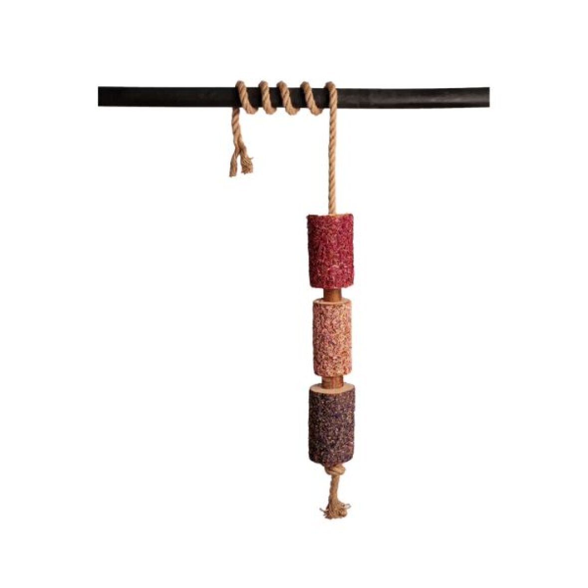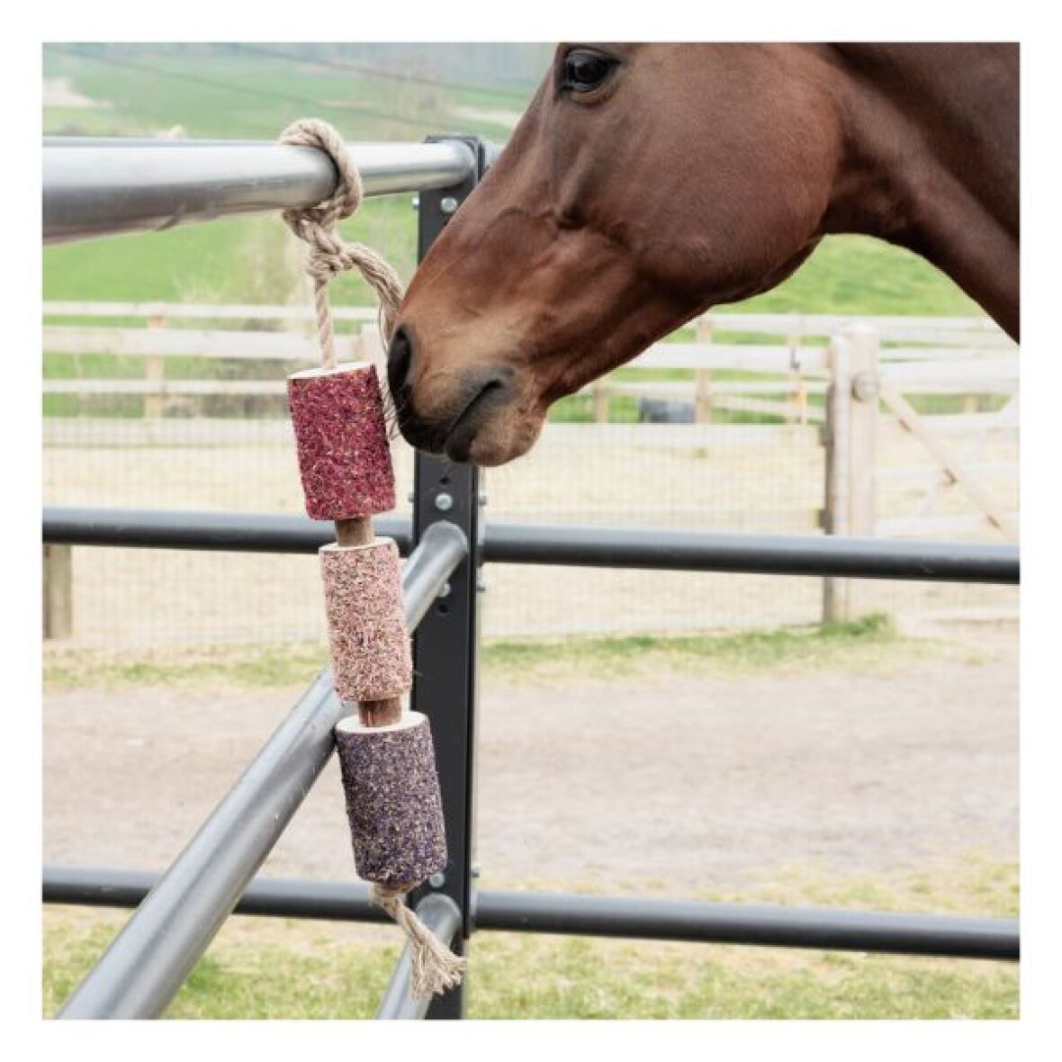 Hestelegetøj i træ fra Kentucky Horsewear. Legetøjet er designet til at aktivere hestens sanser gennem duft, struktur og naturlig tyggeadfærd og bidrager samtidig til mental trivsel i stalden. Unicorn Joy-versionen er beriget med en farverig blanding af blomster, der kombinerer visuel stimulering med naturlige egenskaber, som kan støtte hestens velvære i hverdagen. Malva bidrager med en mild, beroligende effekt og er kendt for at støtte fordøjelsen samt virke lindrende for luftvejene, mens både pink og rød kornblomst tilfører naturlige antioxidanter og er værdsat for deres blide, afstressende og fordøjelsesunderstøttende egenskaber. De forskellige farver og dufte vækker nysgerrighed og giver en sanselig oplevelse, som kan stimulere endorfinfrigivelse og skabe positiv aktivering, når hesten leger og tygger i legetøjet. Hvert stykke træ er håndudvalgt i skoven og efterlades i sin naturlige form for at bevare de autentiske dufte og teksturer, som heste instinktivt tiltrækkes af. Et oplagt valg til heste, der opholder sig meget i stalden, eller som bare fortjener lidt ekstra glæde og variation i hverdagen.