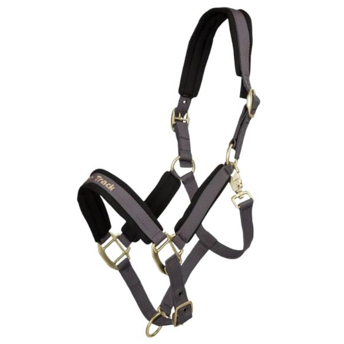 Let og flot grime fra Back on Track. Denne grime er med neoprenforing i nakke, næserem og sidestykkerne og har flotte matte guld farvet spænder. Grimen kan justeres 3 steder i størrelsen og har broderet Back on Track på næseremmen.