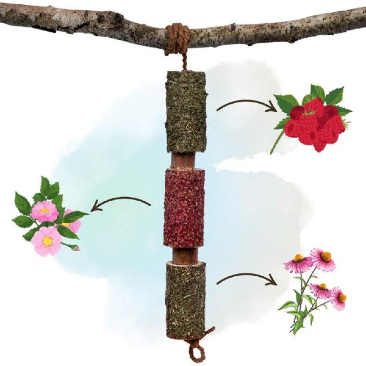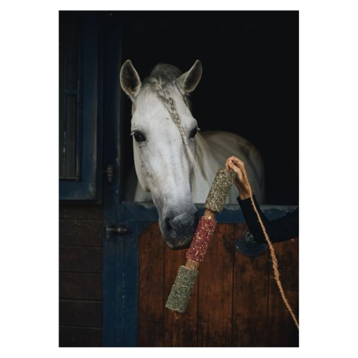 Træ tyggelegetøj fra Candy Horse som hjælper med at reducere kedsomhed i stalden og naturligt støtte immunforsvar, ro og generel vitalitet. Tyggepinden er håndlavet af rå birke- og fyrretræ, som er rige på naturlig saft og en mild skovduft. Kombinationen af smag, struktur og aromaterapi stimulerer hestens sanser, forebygger kedsomhed og giver en beroligende, aktiverende beskæftigelse i boksen eller på folden. Hyben bidrager med antioxidanter og C-vitamin, der styrker immunforsvaret og understøtter kredsløbet. Hindbærblade virker udrensende og støtter fordøjelse, leverfunktion og luftveje, mens echinacea er kendt for sine immunaktiverende og antiinflammatoriske egenskaber, som hjælper hesten med at holde sig robust og komme sig hurtigere. De æteriske olier fra bl.a. rosmarin, basilikum, pebermynte og ingefær tilfører en unik aromaterapeutisk effekt, som du ikke finder i almindelige tyggeprodukter.
