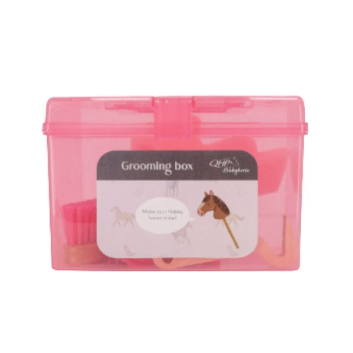 Striglekasse med indhold til kæpheste fra QHP. Kommer med en blød børste, hård børste, hovedbørste, hovrenser og en svamp. Striglekassen er gennemsigtig med et håndtag, der gør den nem at tage med på farten.