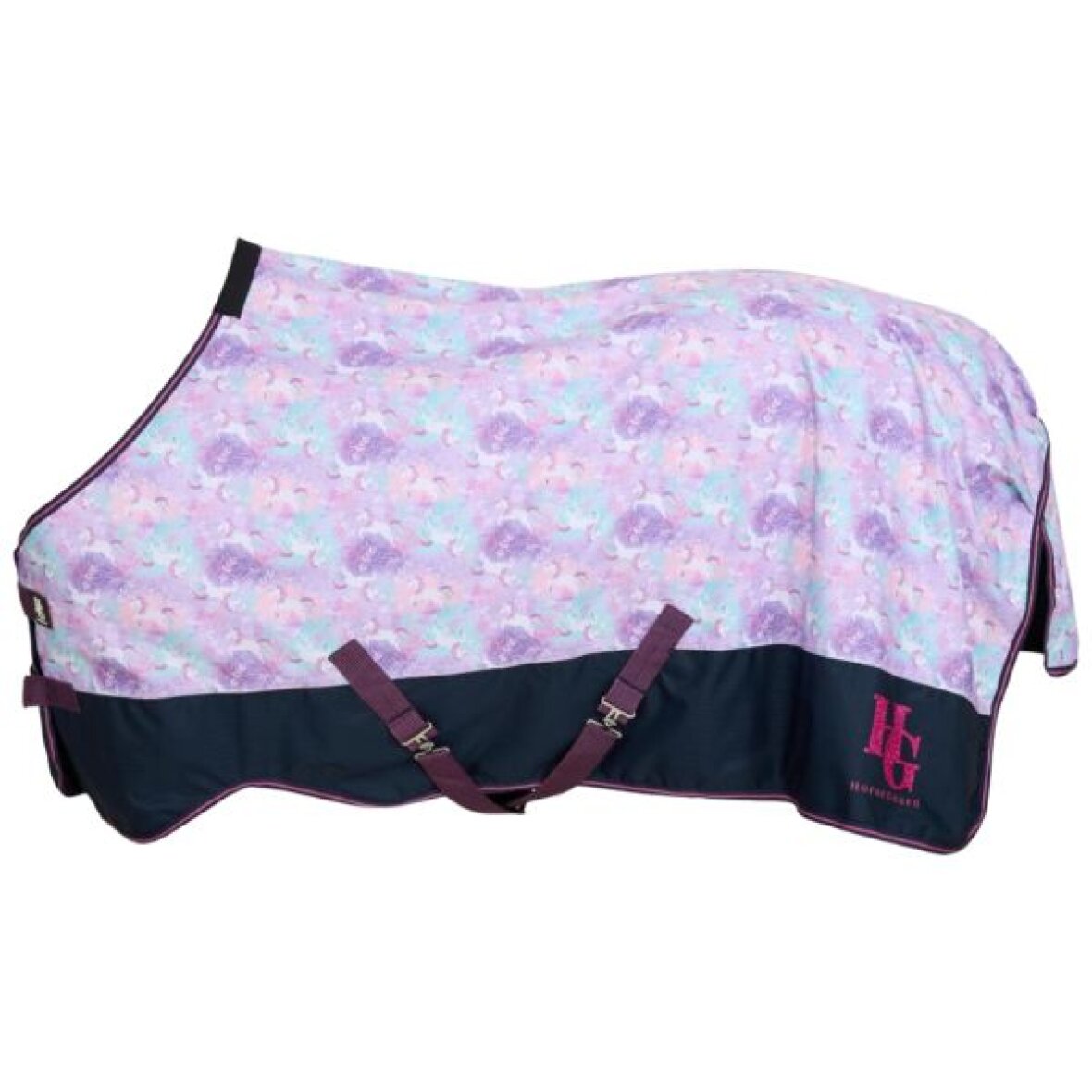 Sødeste regndækken fra HorseGuard med 0 g fyld. Dækkenet er fremstillet i 600D yderstof, der er både 5000 mm vandtæt og 5000 mvp åndbart. Dækkenet er med unicorn motiv og er med justerbare mavestropper, bagbenstropper og haleflap. Et glitrende HG-logo bagpå samt glitterdetaljer i webbing og kantbånd giver et ekstra magisk touch.