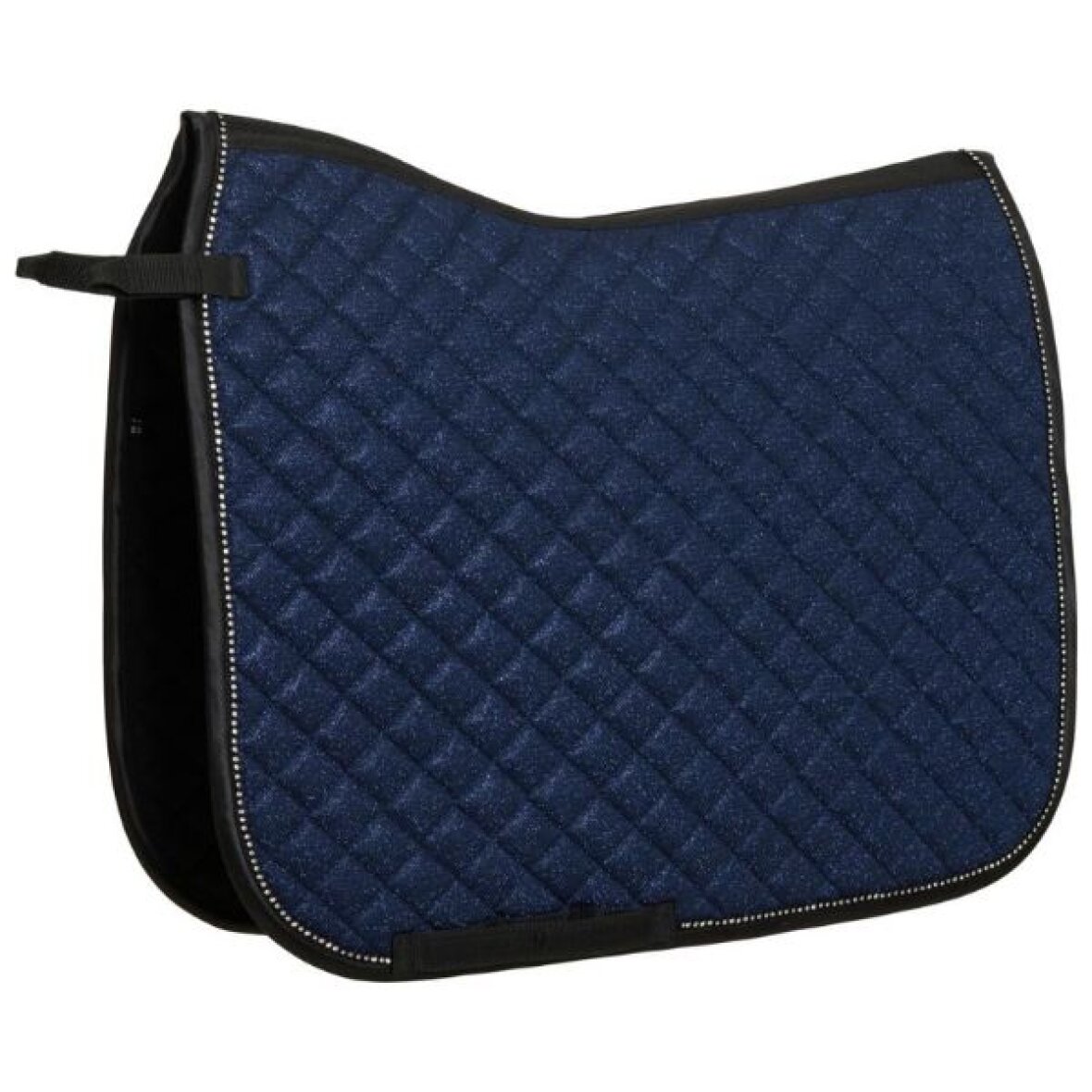 Dressur underlag fra HorseGuard med glitter, satin- og rhinsten kant. Svedtransporterende, åndbart Coolmax-for og 3D-mesh på ryggen for ventilation. 3-rums gjordstrop med et vævet tone-i-tone logomærke på.