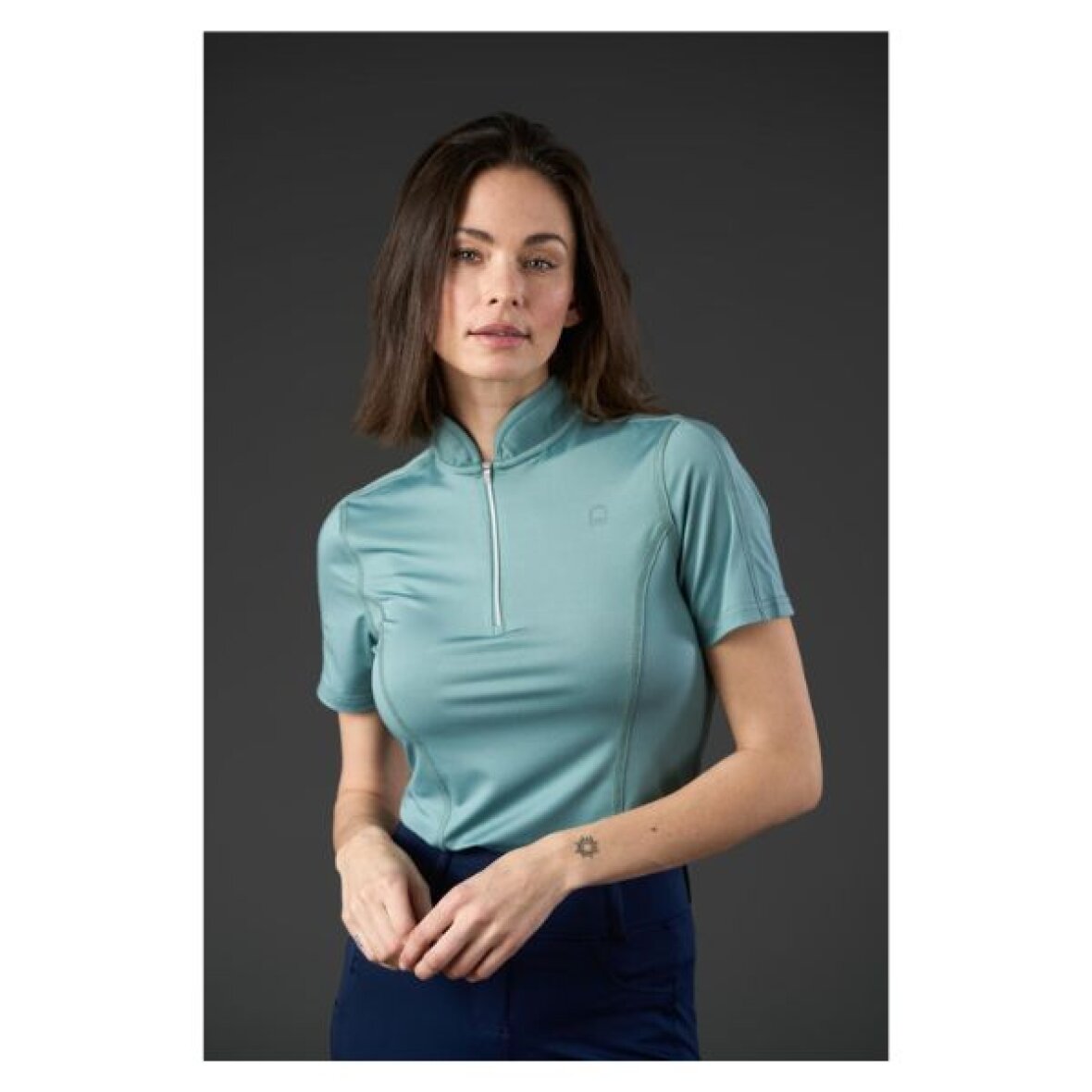 Kortærmet half-zip ridebluse fra Equipage med afrundet krave. Fremstillet i strækbart melange jersey, der er svedtransporterende og tørrer hurtigt. Rideblusen har elegante lodrette skæringer fremhæver den feminine silhuet og en metallisk spiral-lynlås med autolock.