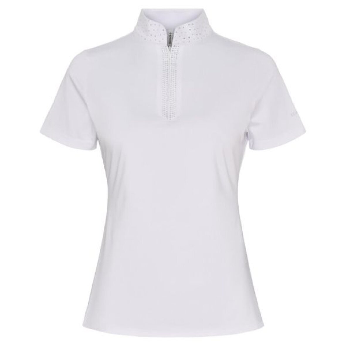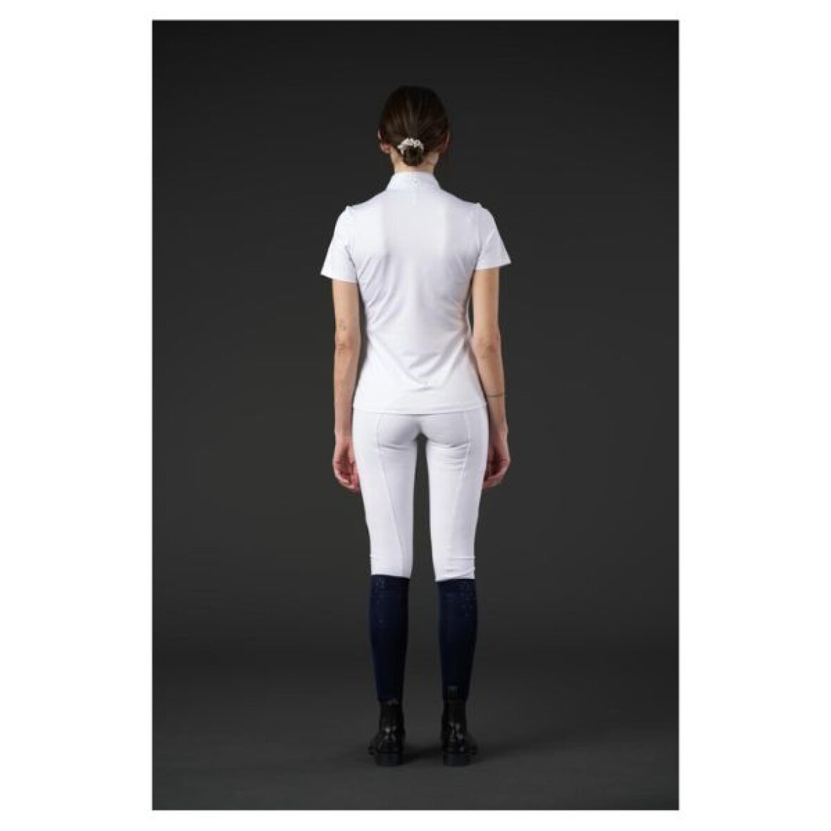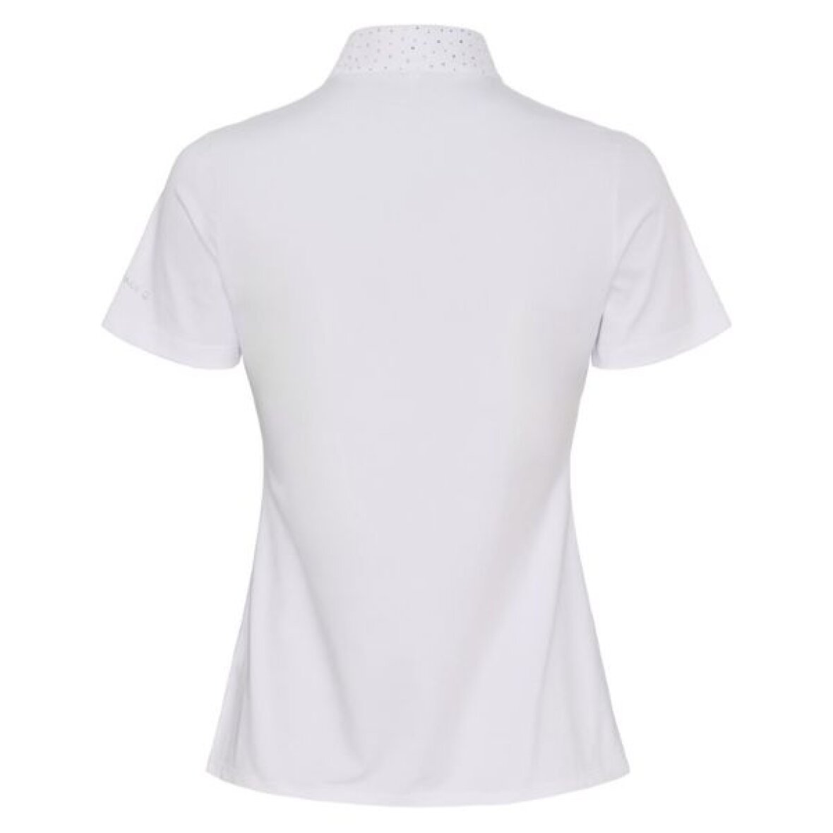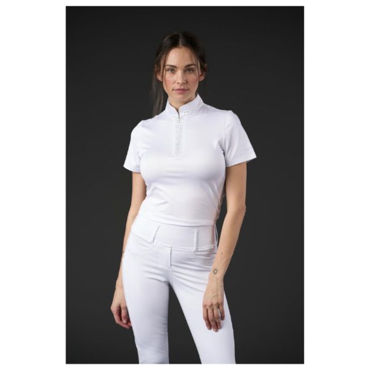 Elegant kortærmet showshirt med smukke detaljer i form af sølvsten ved krave og stolpelukning og sølvglitrende logoprint på ærmet. Skjult lynlås ved stolpelukningen. Enkel silhuet uden snit