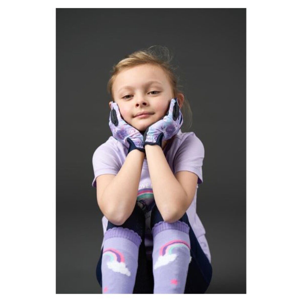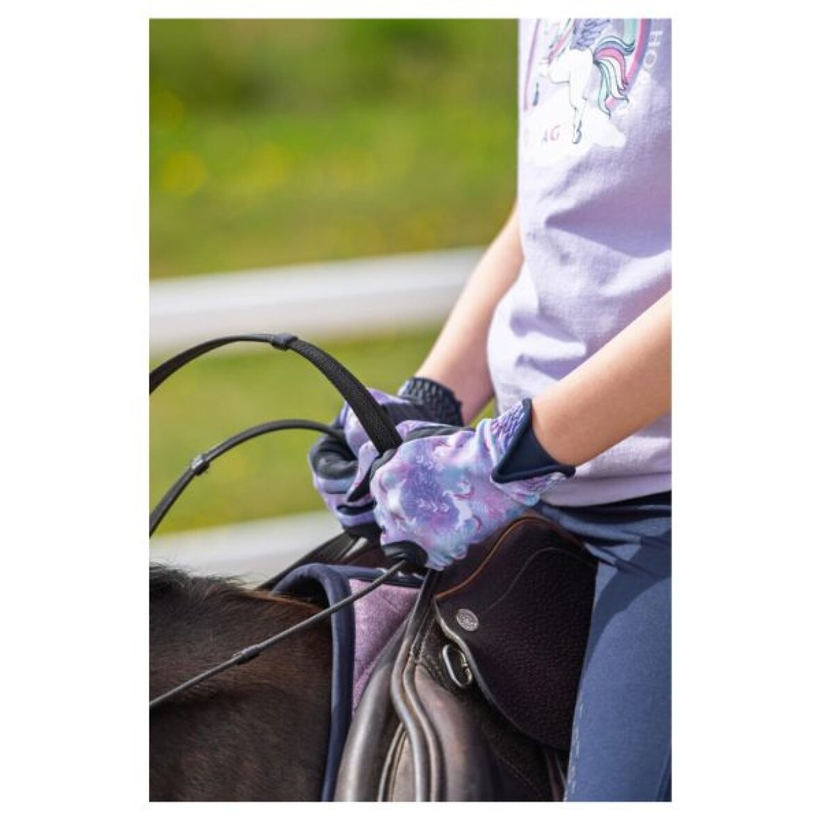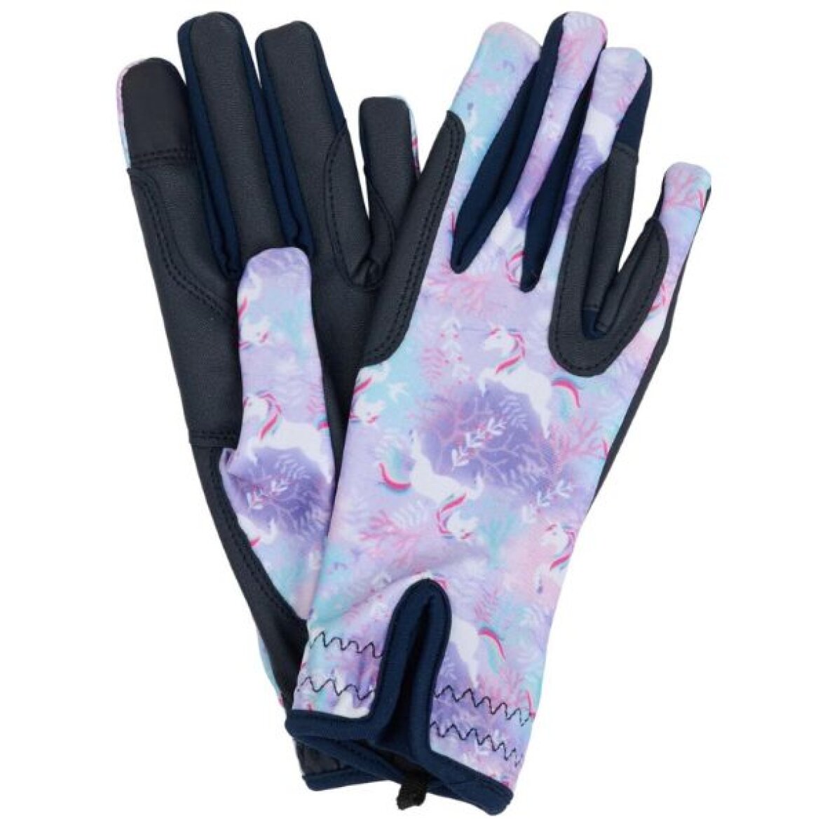 Børne ridehandsker fra Equipage med det sødeste print. Fremstillet af specialblødt syntetisk grip med strækbar, printet Lycra-jersey på håndryggen. Handskens lille Lycra-indlæg ved håndleddet gør den nem at tage på.