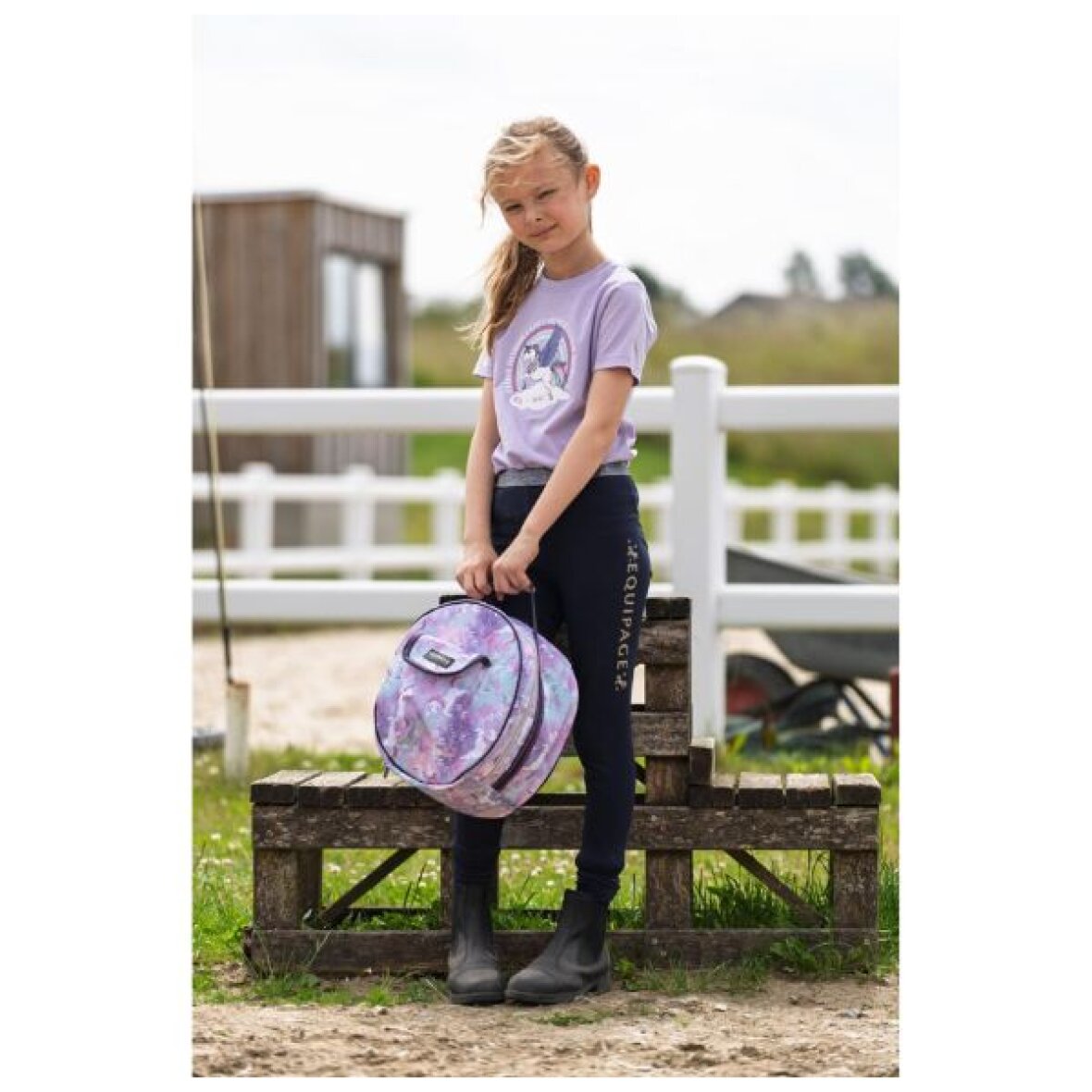 Praktisk og beskyttende børnehjelmtaske fra Equipage. Hjelmtasken er udstyret med et enkelt håndtag i vævet stof samt en lille udvendig lomme med velcrolukning til opbevaring af småting. Hjelmtasken er foret med blødt fyld, som giver ekstra beskyttelse og passer godt på hjelmen under transport og opbevaring. Hjelmtasken har et farverigt allover-print og et hvidt Equipage-gummibadge, som giver et sporty udtryk. Hjelmtasken er desuden udstyret med en rem med glitterstriber og en sølvglitterlynlås, der tilfører et stilfuldt touch.
