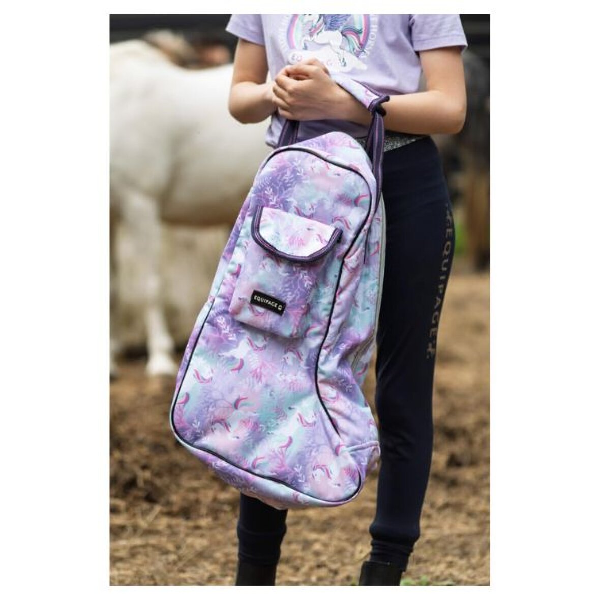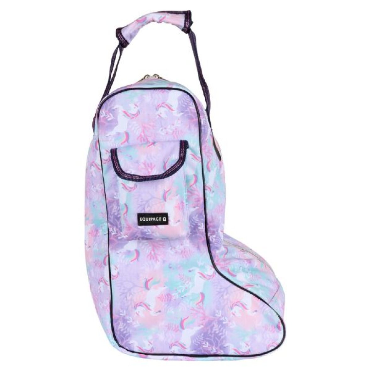 Praktisk og rummelig støvletaske med print fra Equipage. Støvletasken har ét stort rum med lynlås, som gør det nemt at opbevare og transportere støvlerne sikkert og samlet. Støvletasken har et farverigt allover-print og er udstyret med en rem med glitterstriber samt en sølvfarvet lynlås, der giver et ekstra fint og iøjnefaldende look.