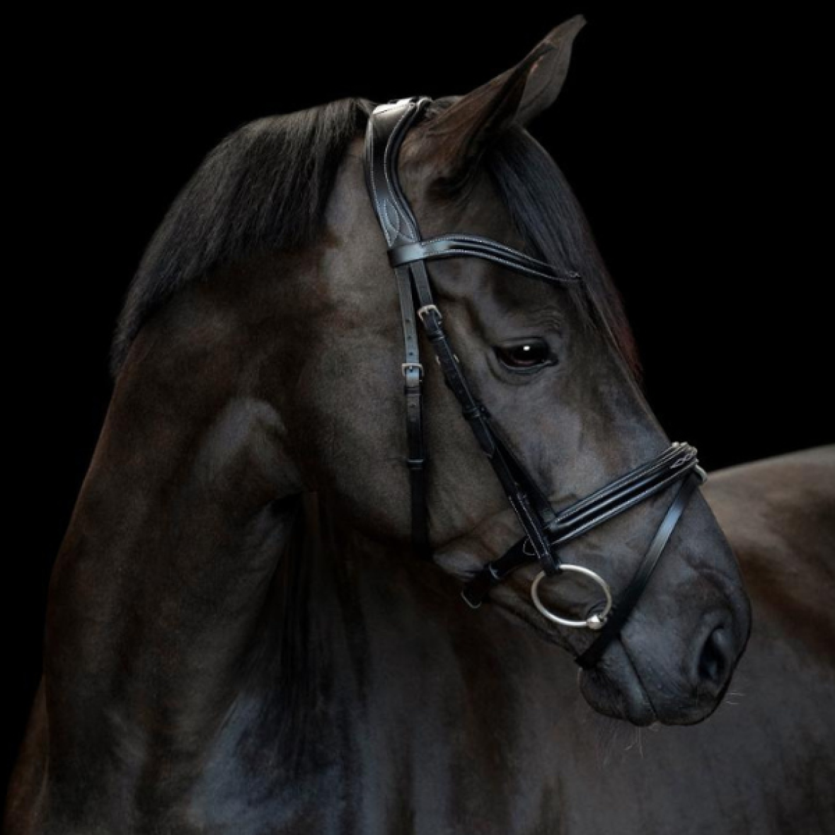 Flot trense fra Catago med blød læderpolstring ved både næsebånd og nakkestykke, som sikrer en behagelig pasform for hesten. Det anatomisk formede nakkestykke er designet til at give ekstra trykaflastning og optimal komfort. De fine kontrastsyninger og den elegante brodering på næsebånd og pandebånd tilfører et eksklusivt og stilfuldt udtryk. Alt metal hardware er udført i sølv, hvilket fuldender det elegante look.