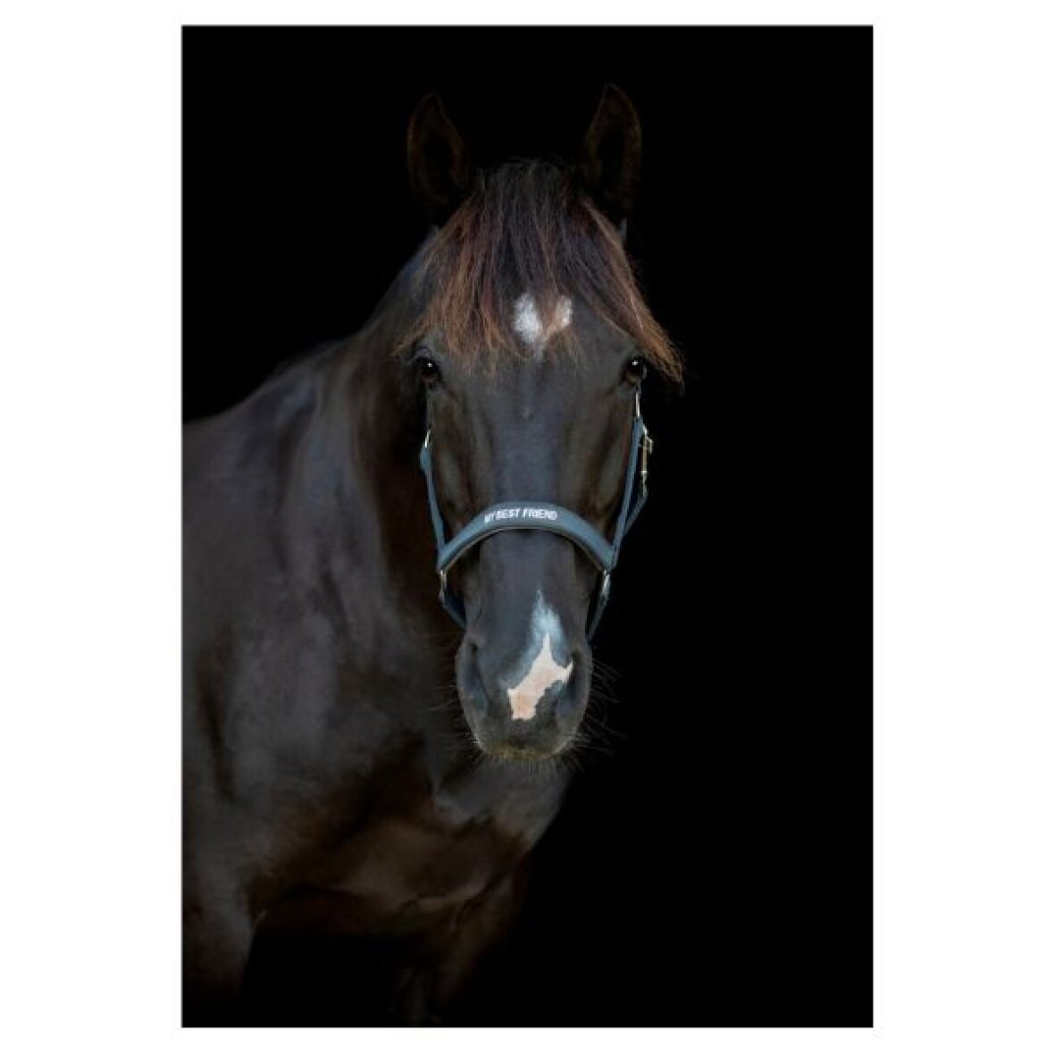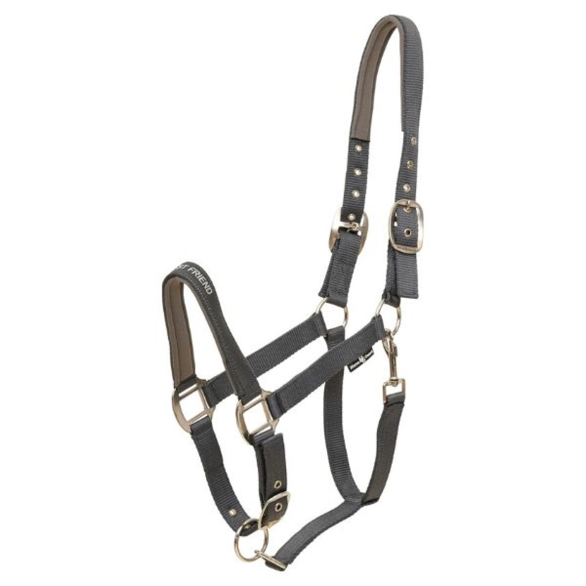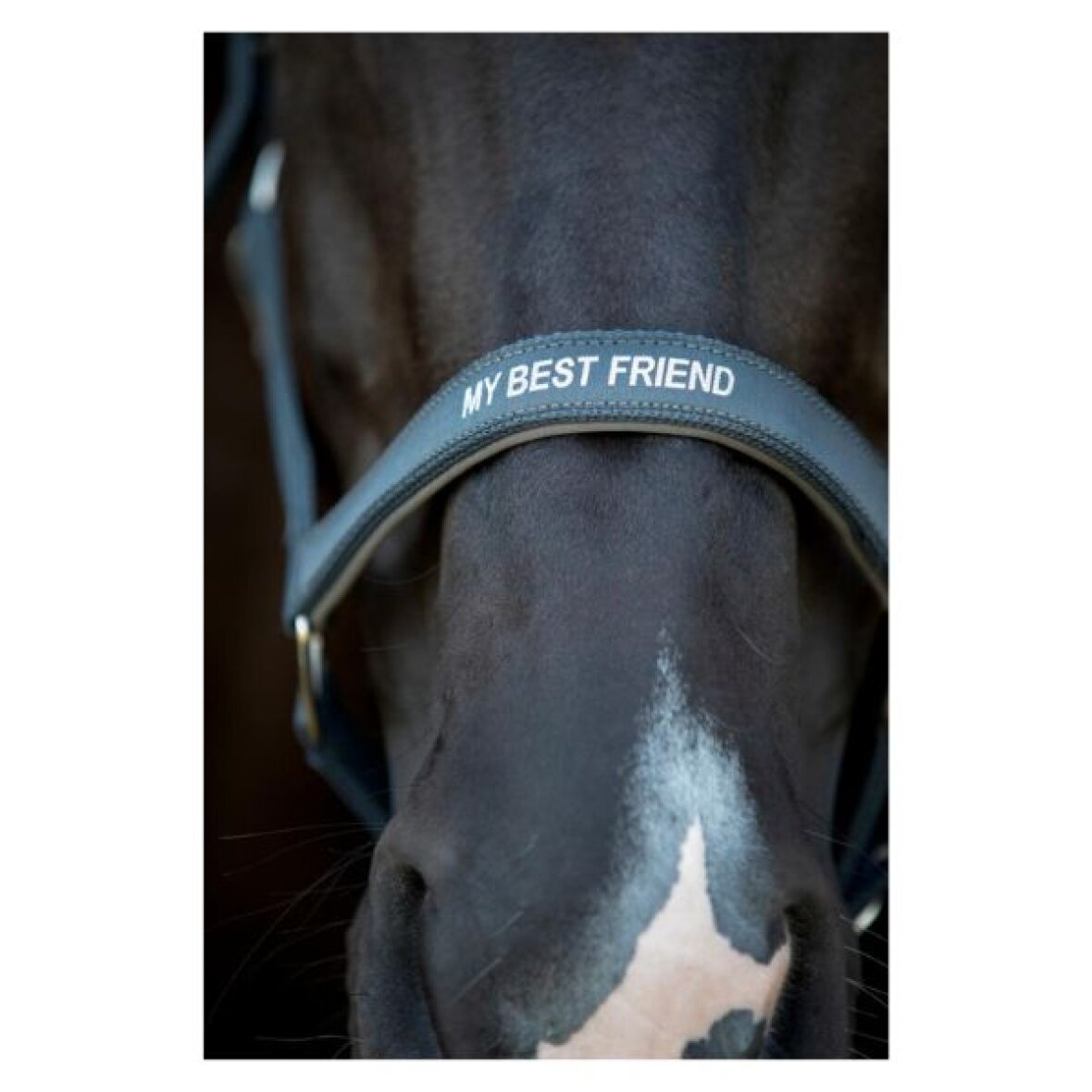 Lækker nylon grime fra HorseGuard. Grimen er med neopren foring i nakke og næserem. Den kan justeres i størrelse 3 steder og er med rustfrit stål spænder. Grimen er med tekst " MY BEST FRIEND" skrevet med sølv glitter tråd.