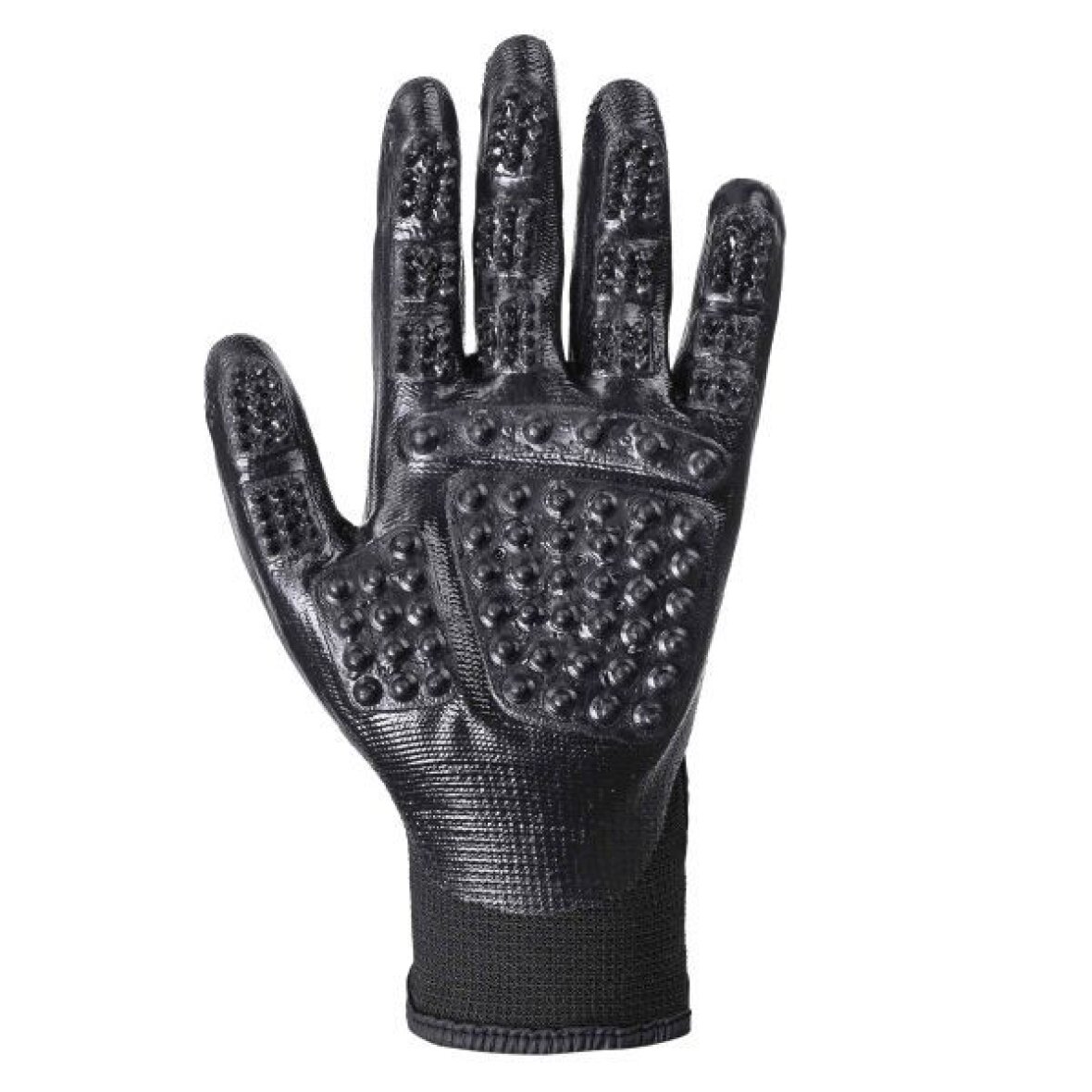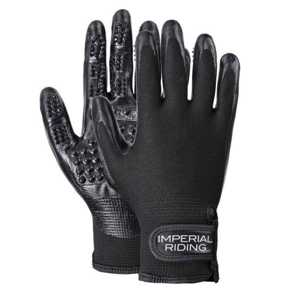 Gnubbe handske fra Imperial Riding. På håndfladen finder du små massageknopper, som effektivt fjerner løse hår og snavs, samtidig med at de giver hesten en behagelig og afslappende massage. Handskerne er derfor ideelle både til grundig vask, til at løsne snavs i pelsen eller til hurtigt at fjerne løse hår i fældningsperioder. Den smarte velcrolukning sørger for, at handskerne sidder godt og komfortabelt under brug. Handskerne leveres som et par
