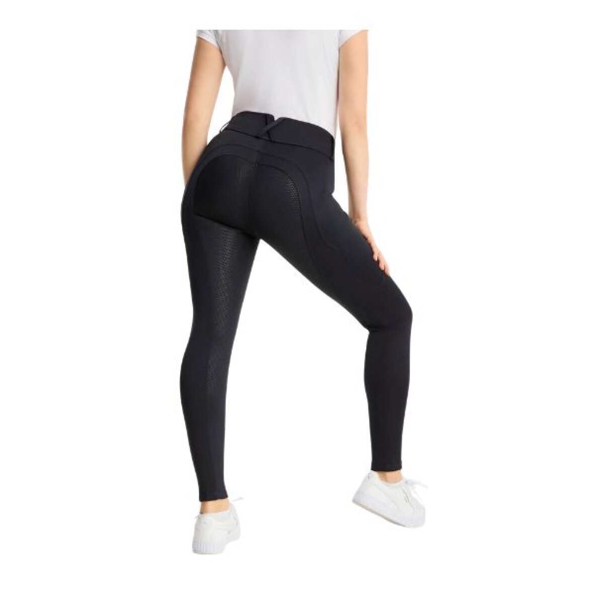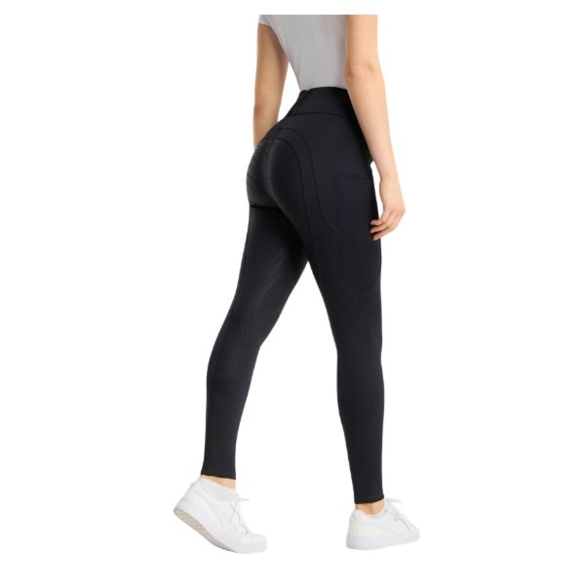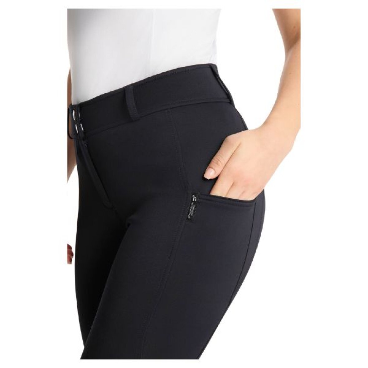 Ridebukser fra Horze med fullgrip. Den brede linning med indvendigt elastikbånd giver en behagelig følelse omkring taljen, mens det åndbare materiale sikrer komfort under hele rideturen. De praktiske mobillommer på begge lår giver plads til mobiltelefon eller andre småting. Ridebukserne er desuden udstyret med lynlås, to trykknapper med logo og bæltestropper.