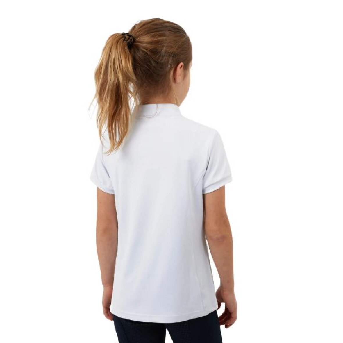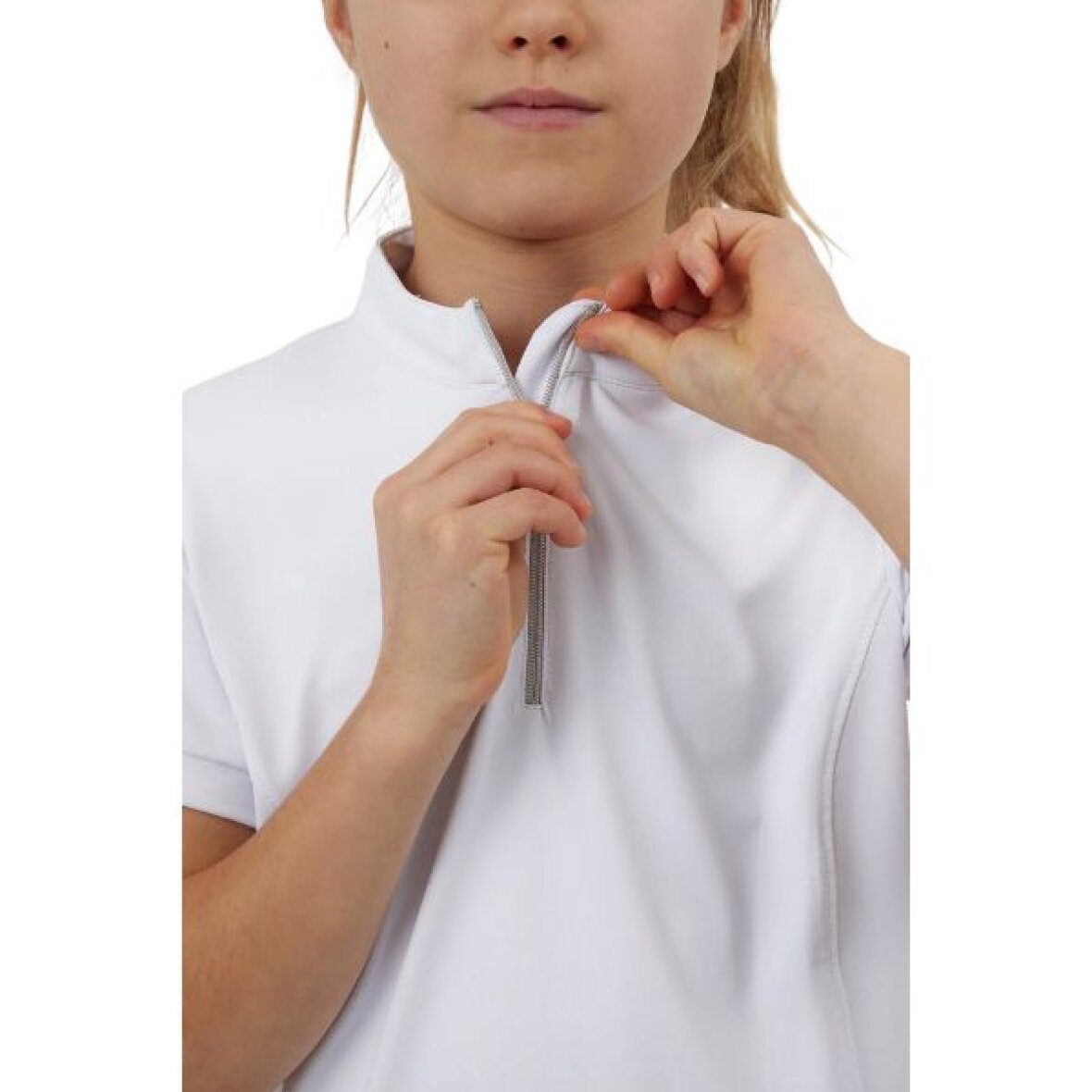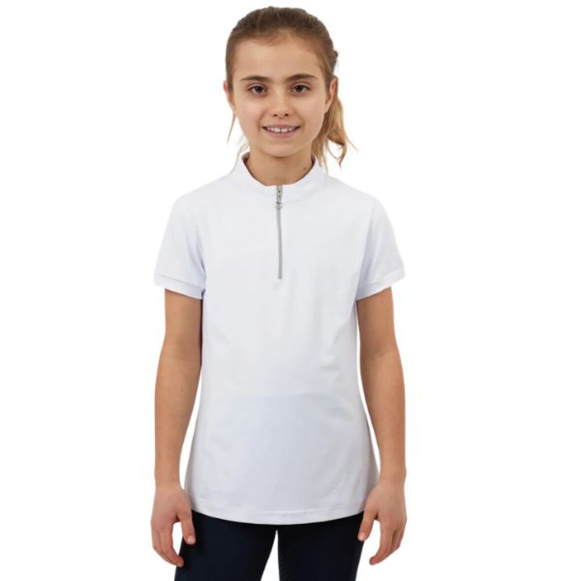 Smart og enkel stævne bluse til børn fra Horze med opretstående krave og half-zip. Denne stævne bluse er fremstillet i åndbart materiale. De formsyede sømme foran skaber en flatterende pasform, mens de korte cap-ærmer tilfører et let udtryk. Lynlåsen er udstyret med en bid-formet lynlåstrækker og et logoprint på venstre skulder fuldender designet.