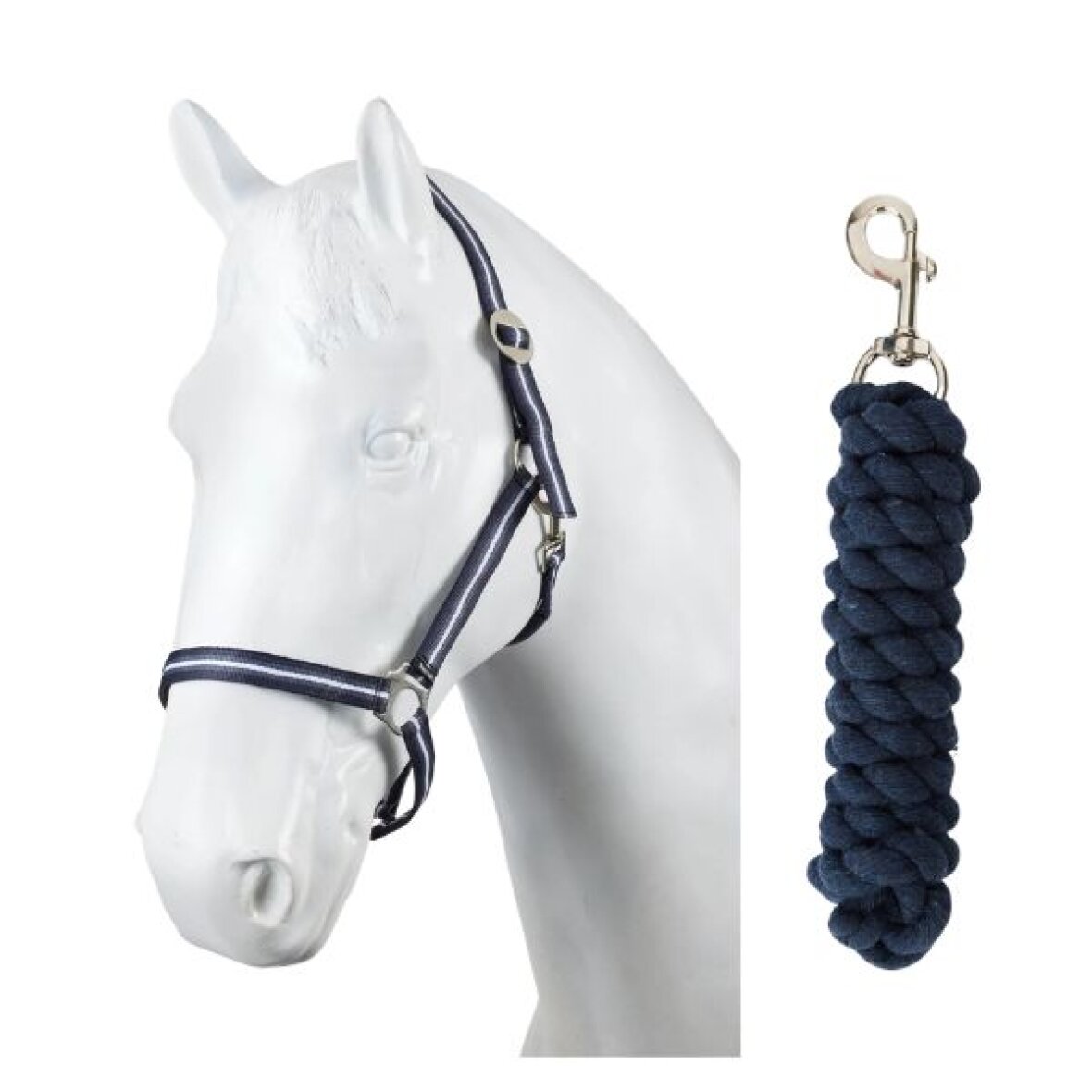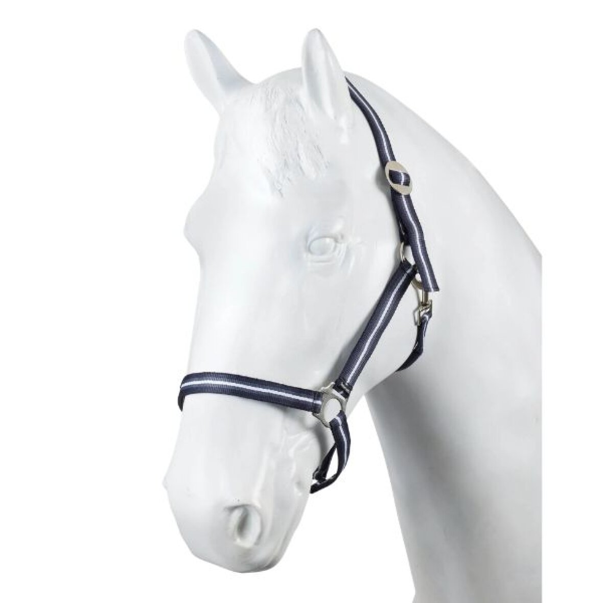Nylon grime med træktov fra Horze. Denne nylon grime er i et flot stribet mønster som kan justeres i størrelse i nakken med glide spænde. Grimen er med sølvfarvet spænder. Matchende bomulds træktov i striber med sølvfarvet karabinhage.