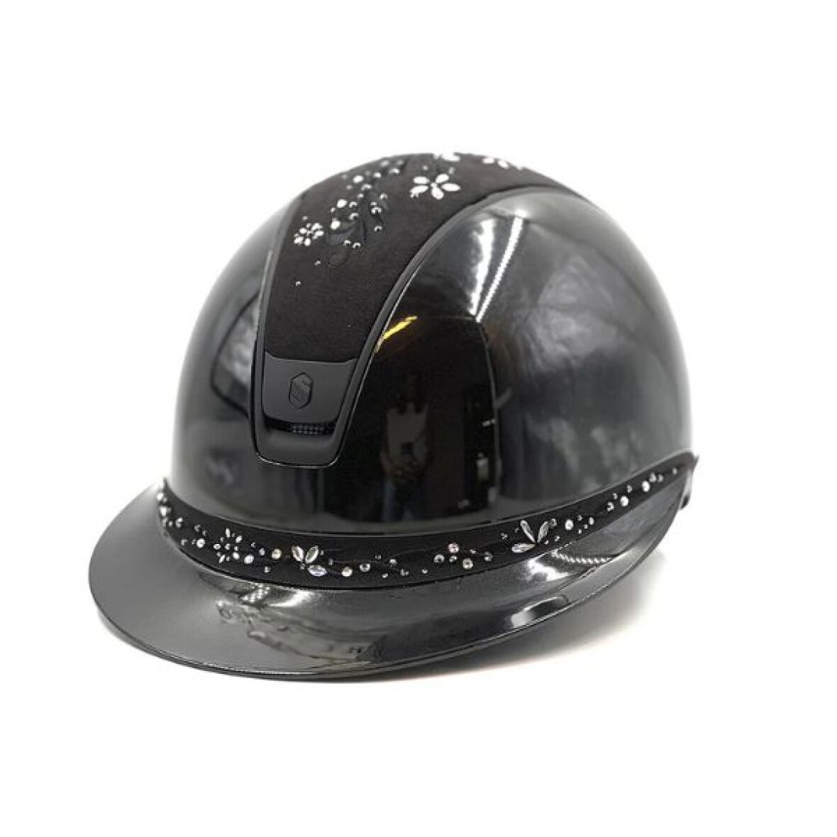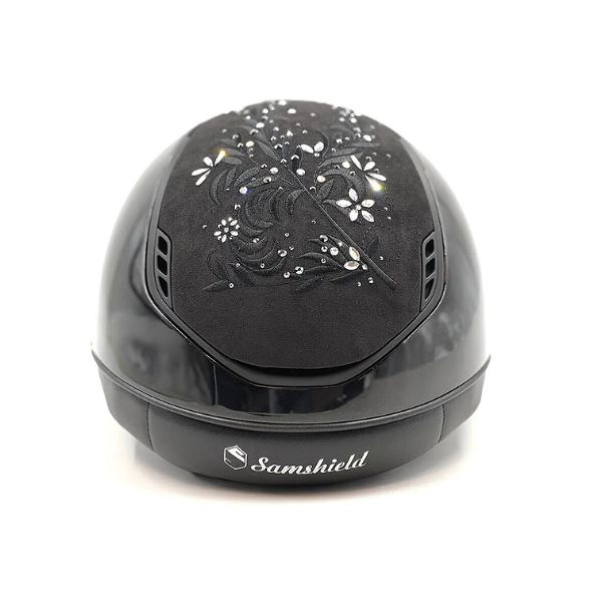 Samshield Miss Shield 2.0 ridehjelm i glossy med Blk flower swarovski top og front bånd. Blason og trimmen er mat black. Hjelmen er med EN1384:2023 godkendelse. Miss Shield 2.0 ridehjelmen har en mere oval pasform som gør at den kommer længere ned på hoved og om nakken. Miss Shield 2.0 har også fået et opgraderet luftindtag foran, som giver enestående ventilation, samt ridehjelmen har ingen direkte tryk på panden, så man undgår sved og hovedpine.
