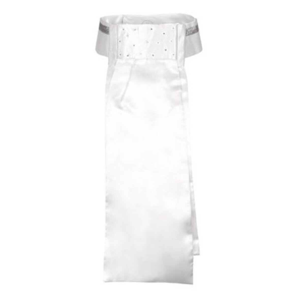 Hvid satin plastron fra Harrys Horse. Denne plastron lukkes i nakken med velcro og har krystaller på fronten. Sølvfarvet kantbånd rundt om halsen.