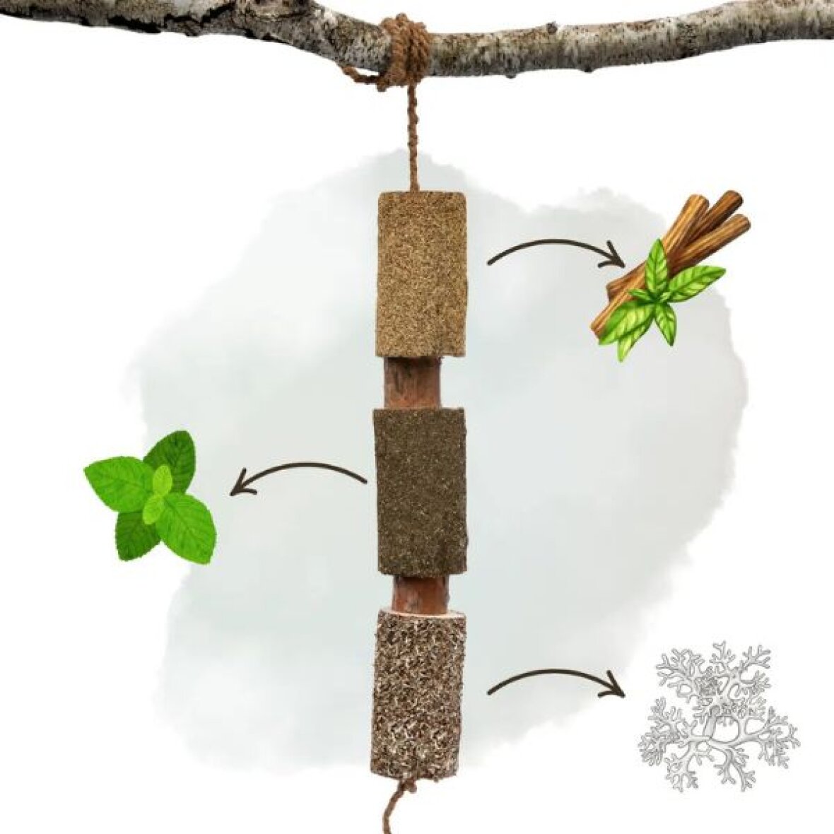 Træ tyggelegetøj fra Candy Horse som hjælper med at reducere kedsomhed i stalden og naturligt støtter, restitution, ro og lindre fordøjelsen. Tyggepinden er håndlavet af rå birke- og fyrretræ, som er rige på naturlig saft og en mild skovduft. Kombinationen af smag, struktur og aromaterapi stimulerer hestens sanser, forebygger kedsomhed og giver en beroligende, aktiverende beskæftigelse i boksen eller på folden.
