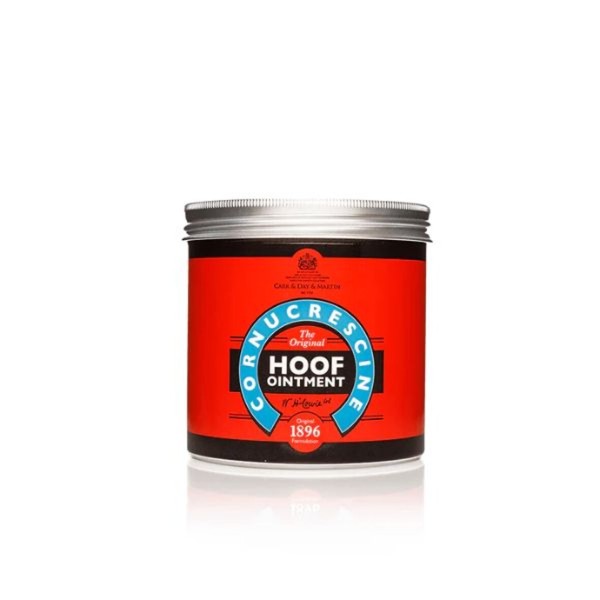 Cornucrescine Original Hoof Ointment fra Carr Day Martin er en unik hov creme som fremmer horn kvaliteten og accelerer hov væksten. Cremen er på original opskrift siden 1896. Denne hov creme masseres ind i kronranden ved hjælp af fingeren eller stiv tandbørste, og kan også anvendes til at lukke eventuelle revner i hoven. Den vedligeholder den sunde hov og hjælper til at genetablerer hoven. Samtidigt stimulerer cremen produktion af keratin celler og er derfor god, hvis hesten har brug for ekstra hov vækst. Indeholder 500 ml.