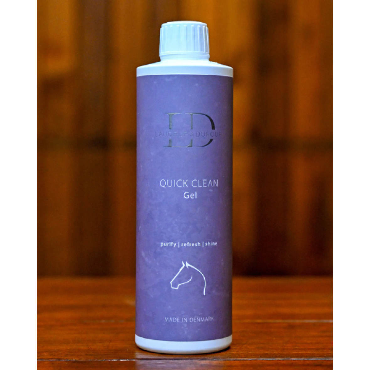 Quick clean gel fra Laudrup & Dufour er en pletfjerne som ikke kræver vand. Så har hesten skidt og snavs på pels, man eller i halen så påfør denne gel på en svamp eller en klud og gnid på pletterne. Når pletterne er tørret op er hesten ren og fin igen, gelen hverken fedter eller klistre. Denne gel indeholder 500 ml.