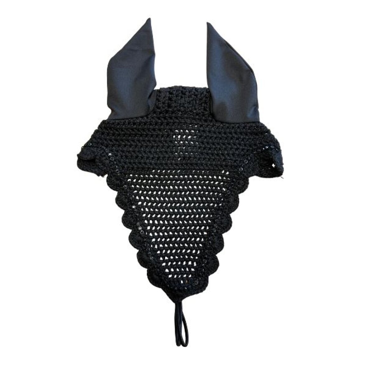 Hæklet hut fra Catago med deep cut. Hæklede kanter og sorte lurex-rhinsten. Sort Catago logoet i nakken. Elastisk løkke nederst til fastgørelse på næsebåndet.