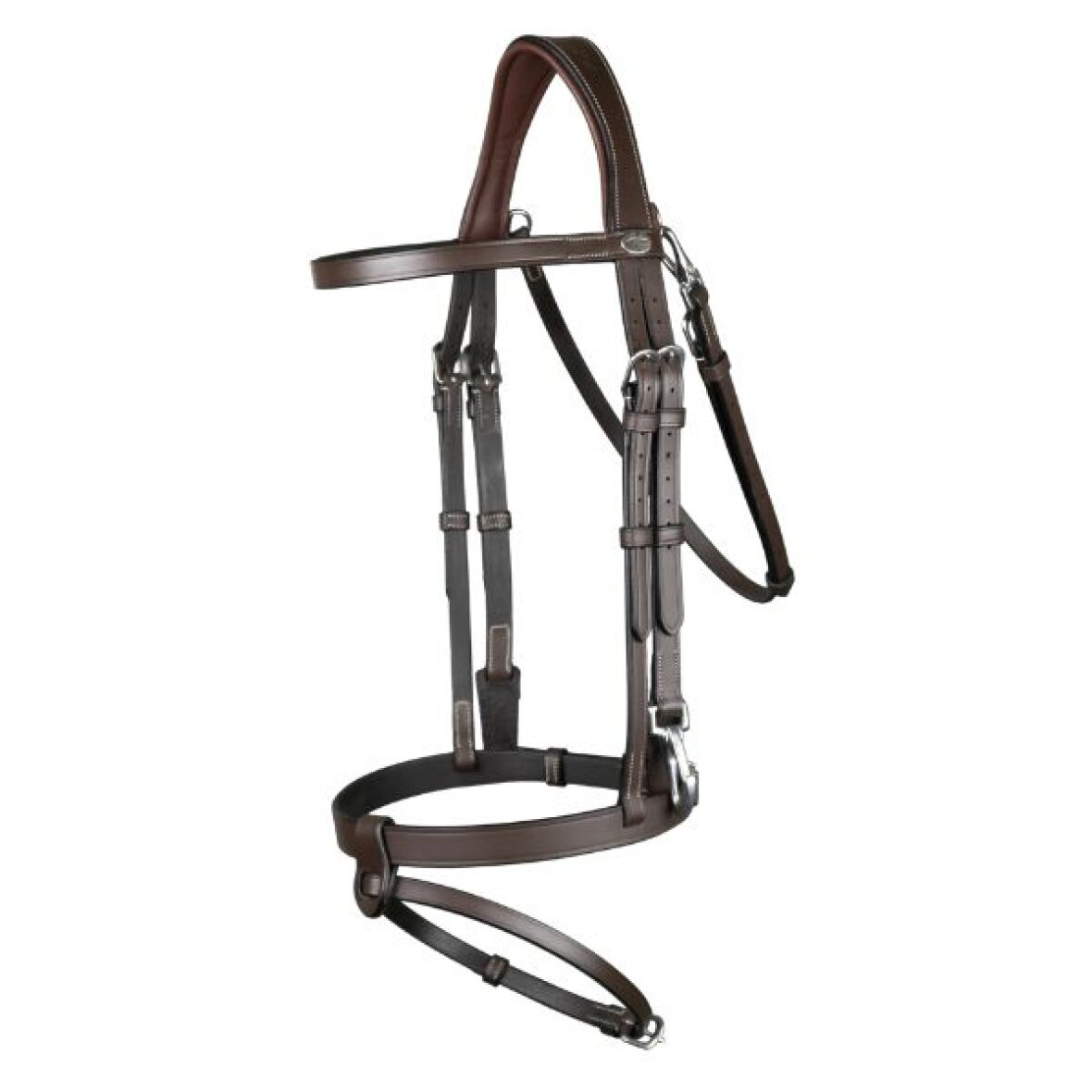 Flat trense fra DYON's working collection i buffalo læder med anatomisk polstret nakkestykke. Fladt næse- og pandebånd. Aftagelig næsebånd. regulerbar karabinhage i rustfri stål. Spænder i rustfri stål.