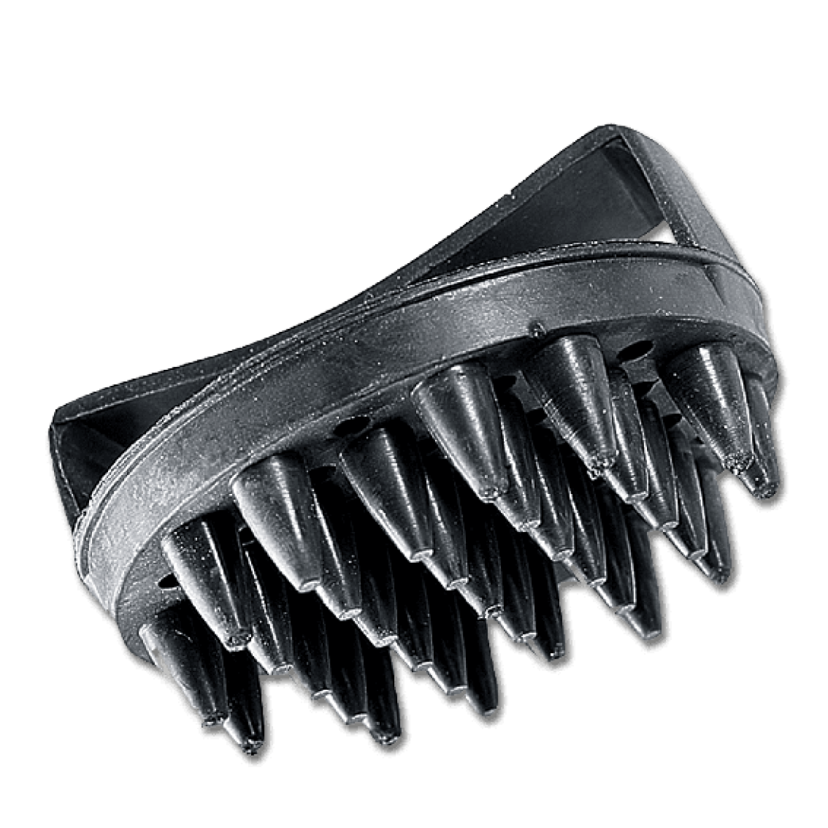 Gummi gnubber fra Waldhausen. Denne gnubber er med knopper og fjerner effektivt løse hår, skæl og støv fra hestens pels. Derudover har denne gnubber en masserende effekt.