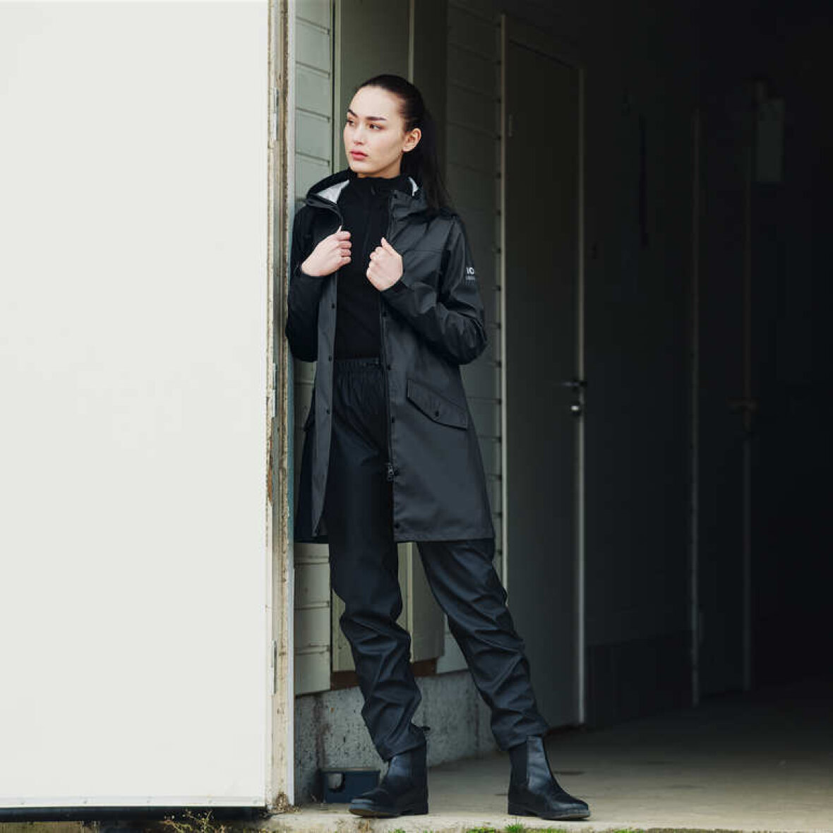 Regnjakke fra Horze i klassisk design, lavet i stretch PU-materiale. Jakken har store lommer med trykknapper foran og er med 2-vejs lynlås. Den har trykknapper foran og er med justerbar hætte og manchetter og med reflekterende print på ærmet. Den er lavet i solidt materiale og har en perfekt pasform.