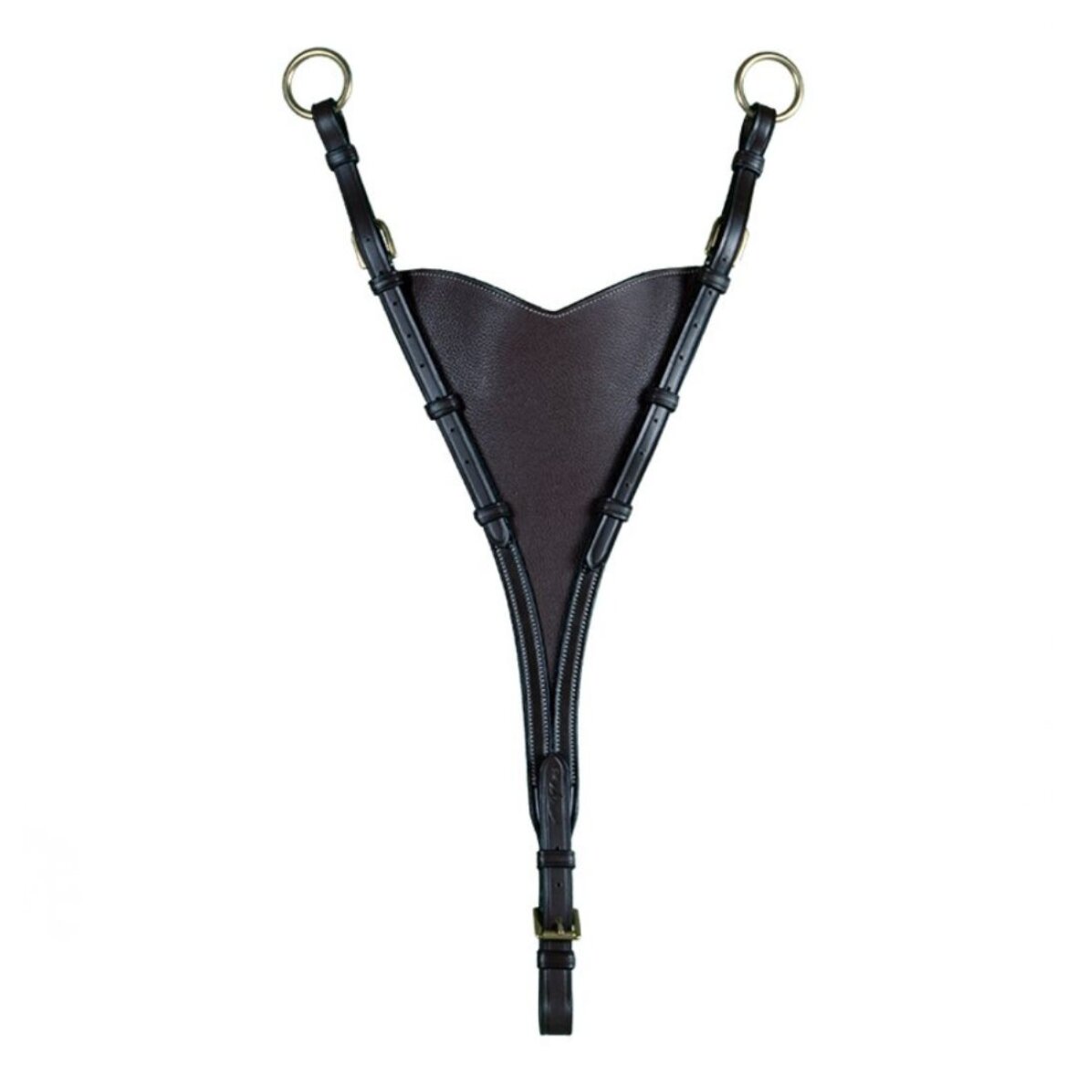 Martingal plade i engelsk læder, til at fastgøre på et fortøj. Den er med messing spænder og cremefarvet stikninger.