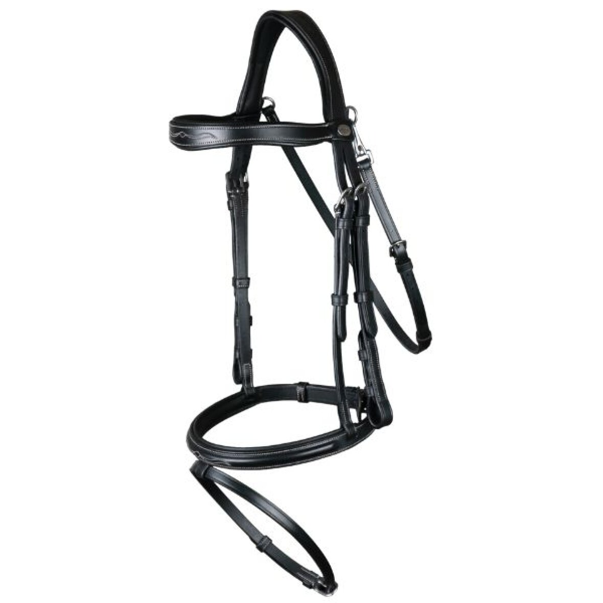 Næse og pandebånd er let polstret og med smukt mønster indsyet. Trensen er med hvide stikninger, stål spænder og karabinhager.