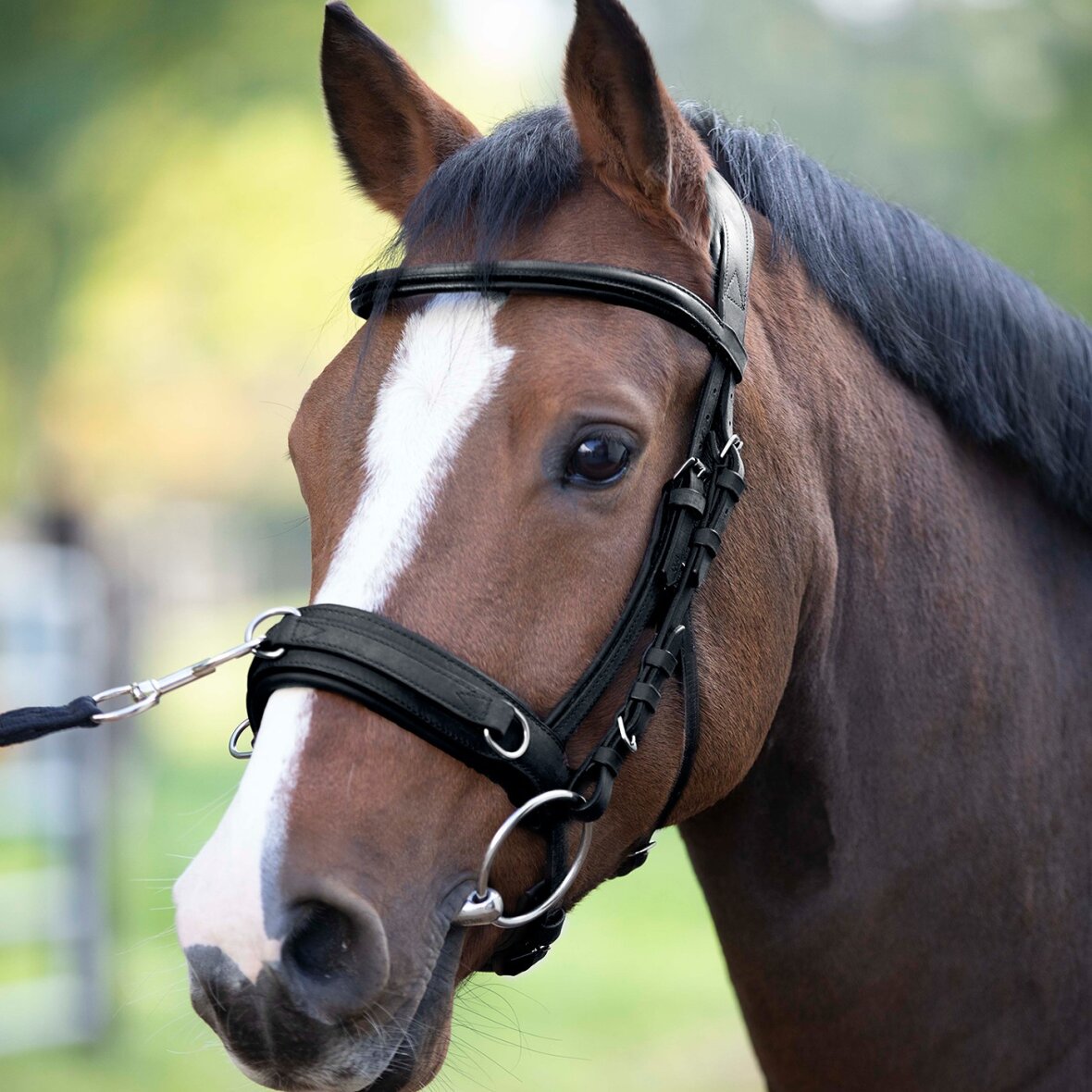 Longerings trense i kvalitets læder med anatomisk nakkestykke som giver mere luft ved ørerne og kindstykkerne, trensen er med tyk polstring i næse og nakkestykket samt kan bruges med og uden bid.